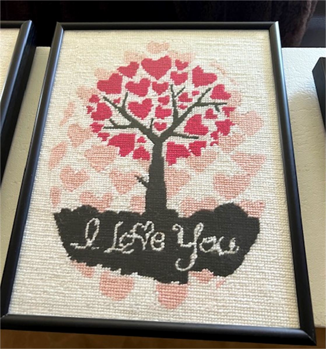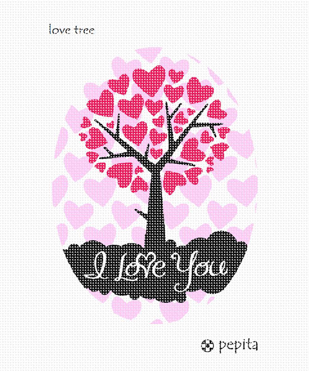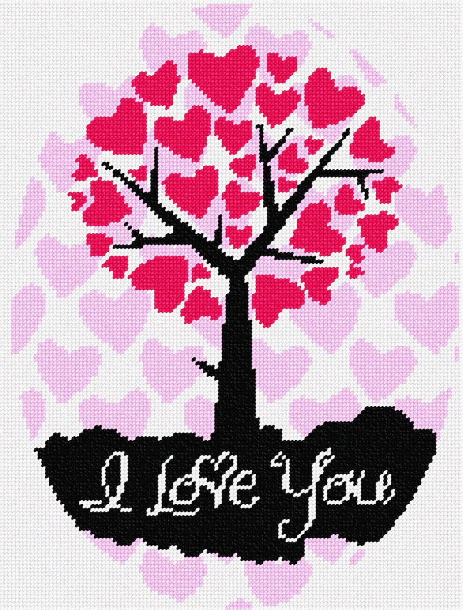 I love you, written in cursive beneath a tree with pink hearts for leaves, against a sky dotted with hearts.