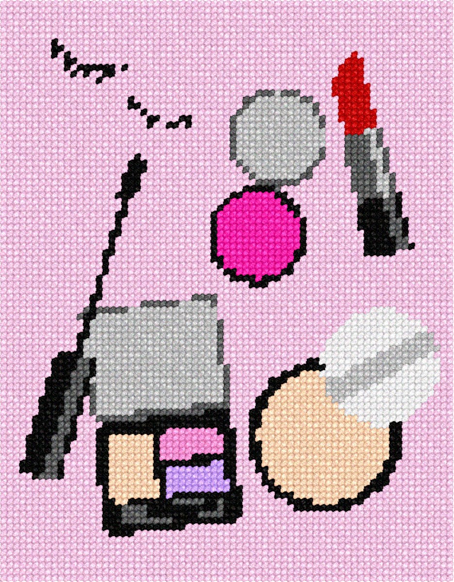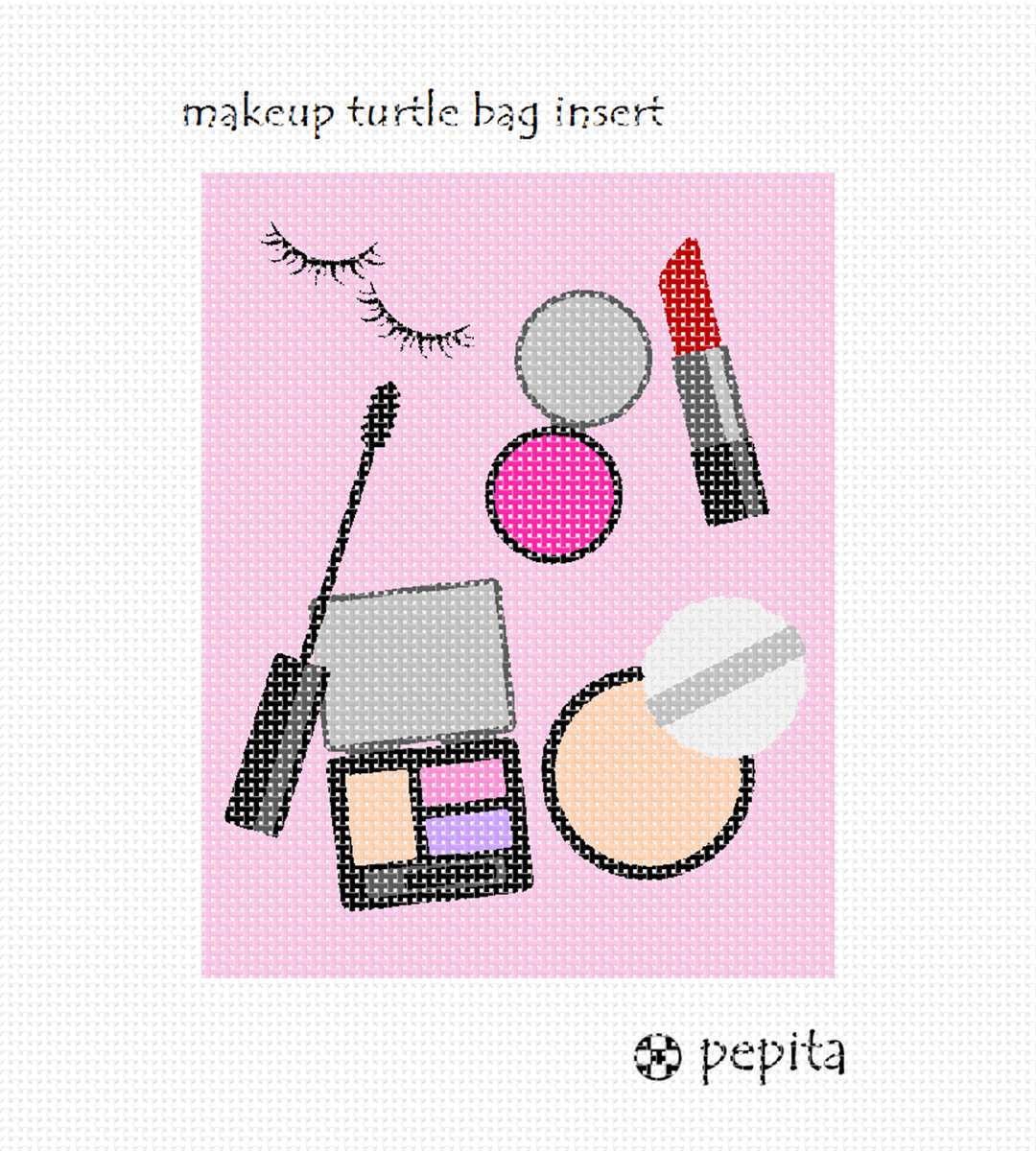 Stitch a shell for your new turtle bag. Turtle bags are tote bags that come with a window for interchangeable designs. This makeup design can also be stitched as a regular beginner needlepoint project. It measures 5.5 X 7, so adjust the stitching area to 5 X 7 and frame with a ready made frame.