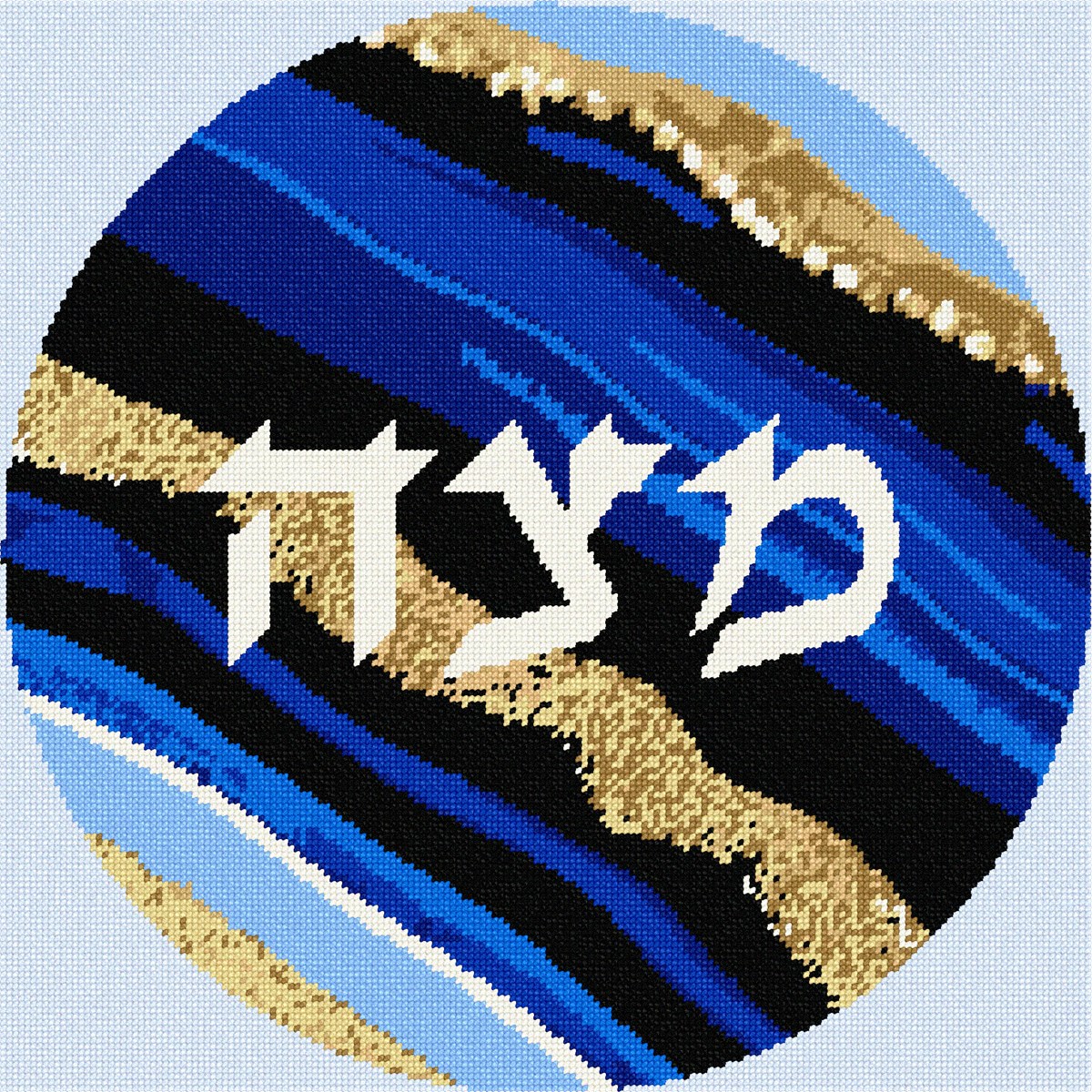 A geode is a stone having a cavity lined with crystals or mineral matter. Most geodes contain clear quartz crystals. Geodes are found all over the world especially in desert regions.This summer I experimented with resin art to create geode looks on glass. That inspired me to design tefillin, tallit, and challah covers with geode characteristics. This one is a collage of geode patterns. This matzoh cover needlepoint for Pesach that will cover the entire matzoh. There is no need for a frame-out when finishing it into an actual matzoh cover. This contemporary design is a classic and will never go out of style. This design is truly fit for a king. See coordintating afikoman bag. This is used to cover the three Matzohs at the Passover seder. It is also used to cover the two Matzohs used at the other Passover meals.