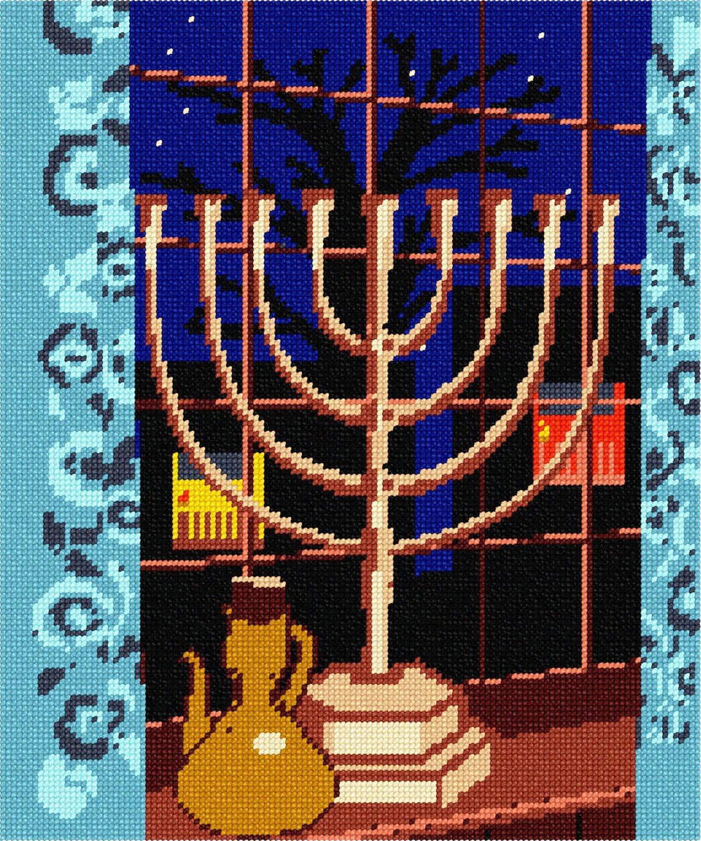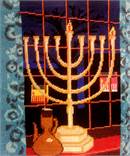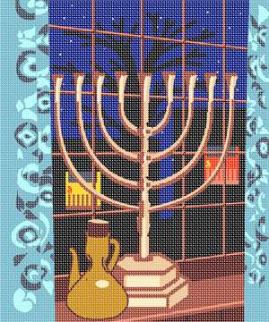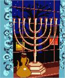 A tall and stately menorah awaits the lighting on the first night of Hannukah. Hanukkah, or Chanukah, is a Jewish holiday eight days long. Each night another candle of the menorah is lit. It is a special time to share with family. Playing dreidel, eating latkes and donuts, and chanukah gelt are all part of the tradition.