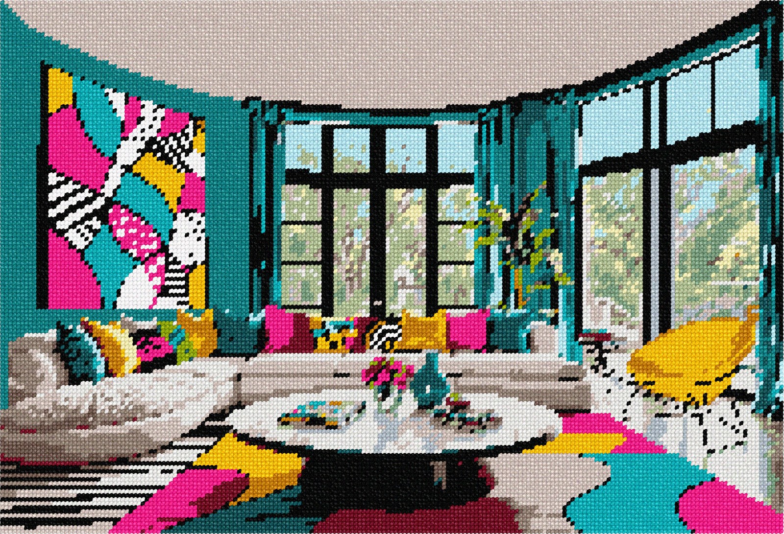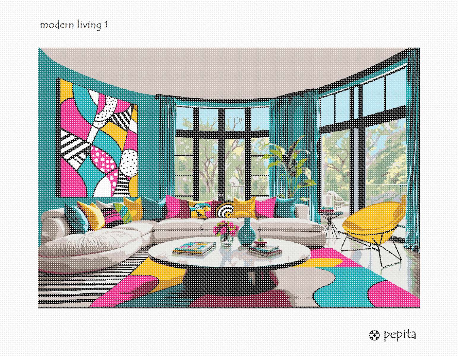 Our new home collection with room decor that is up to date and trendy. See coordinating painting on the wall needlepoint, and stitch as a set. Cool!