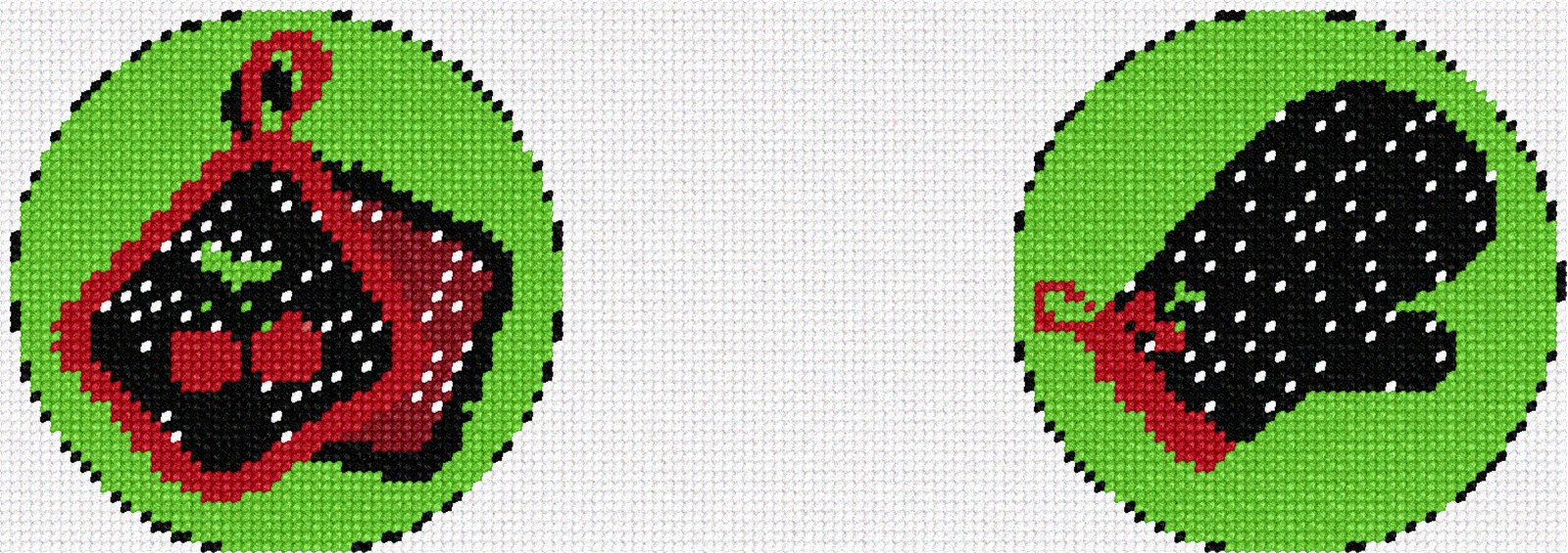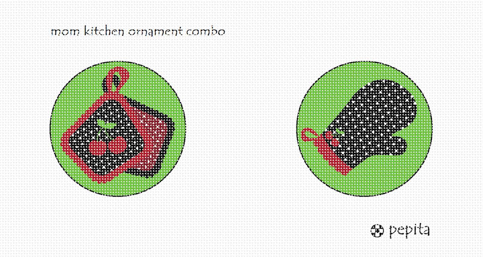 New! Pepita now designs ornaments. These are paired and sold as a set. This one has an oven mitt ornament and pot holders ornament. Stitch two for the price of one. Note these are 18 mesh canvases.