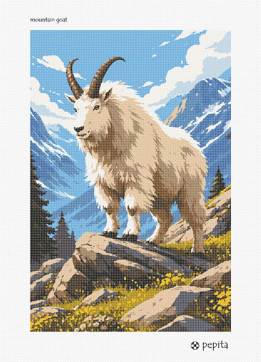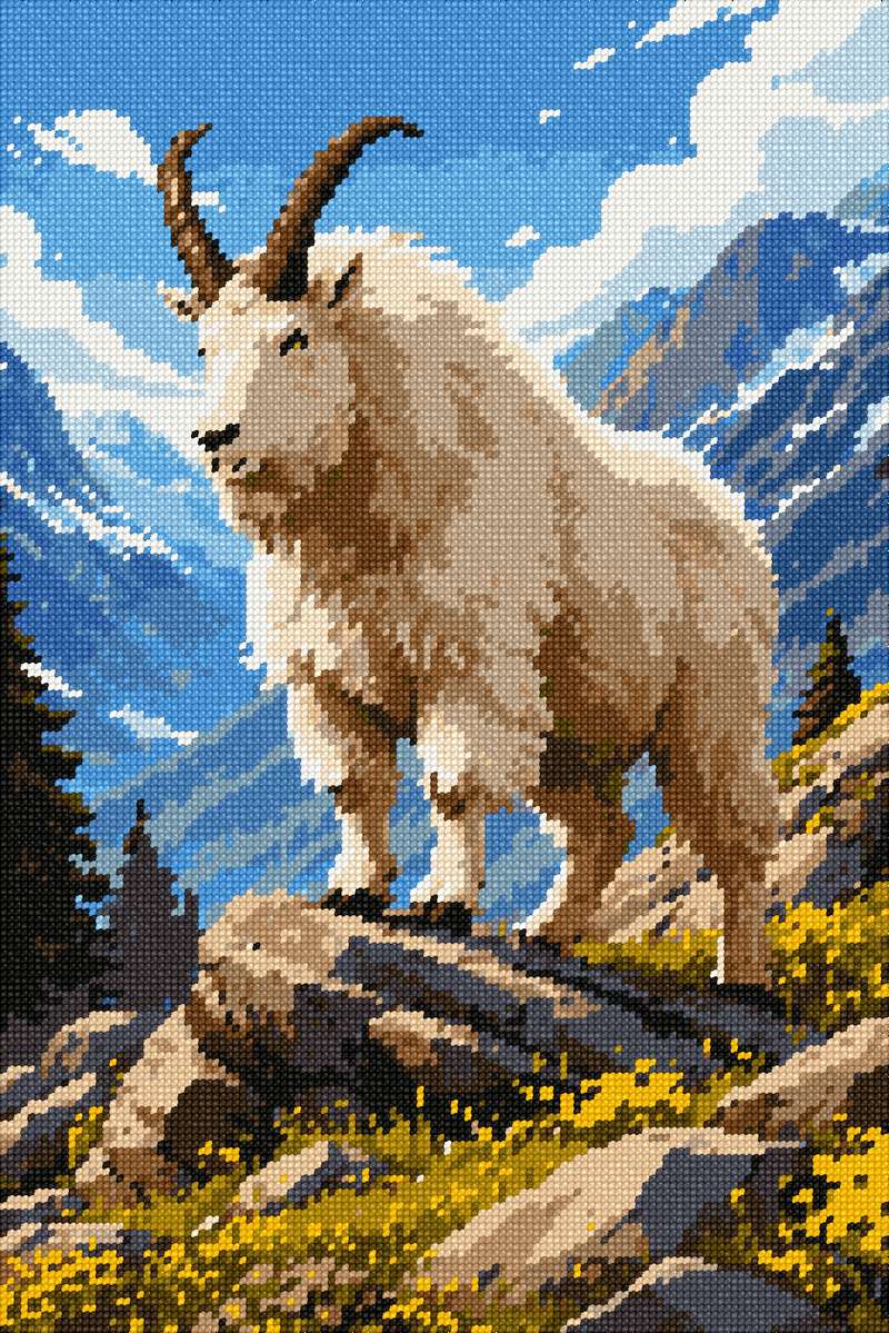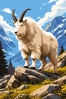 A majestic mountain goat stands prominently against the backdrop of towering blue mountains and a clear sky, encapsulating the essence of wildlife in rugged terrain. The vibrant color palette features crisp blues, earthy browns, and vivid yellows, creating a serene yet dynamic mood. The composition uniquely captures the goat’s powerful stance on rocky terrain, evoking a sense of strength and freedom.