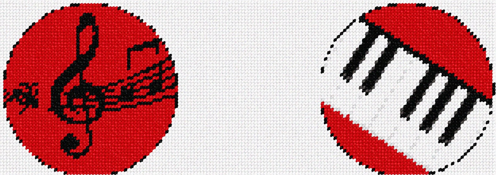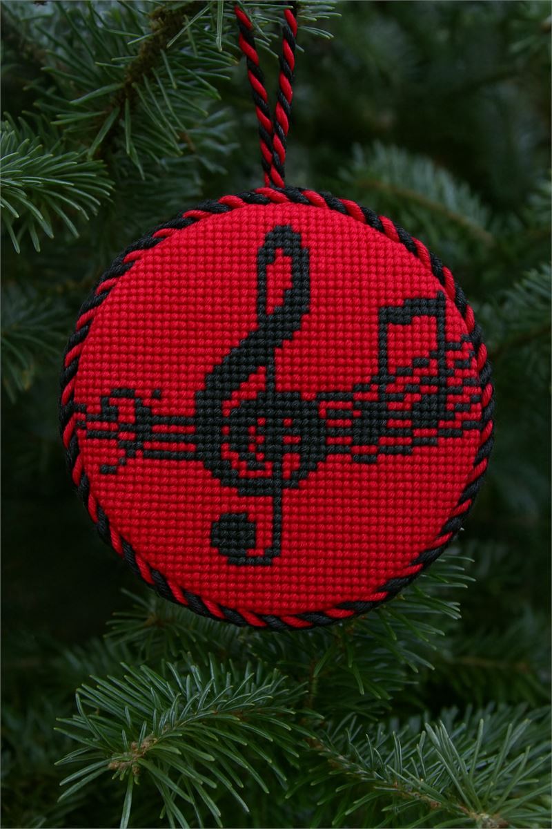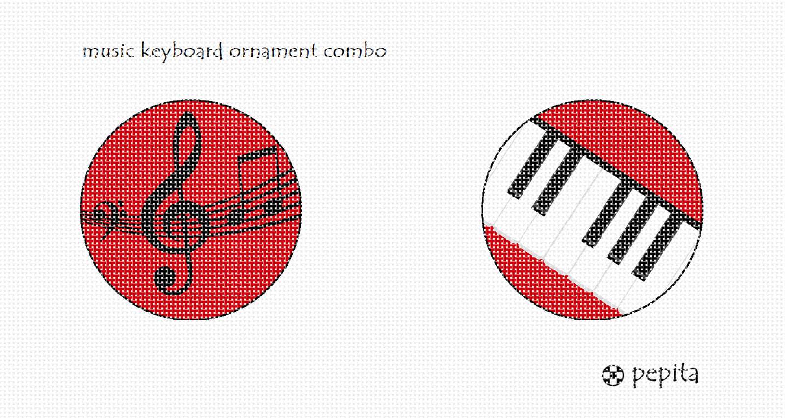 New! Pepita now designs ornaments. These are paired and sold as a set. This one has a music notes ornament and a piano keyboard ornament. Stitch two for the price of one. This is for the musician in your life. 18 mesh