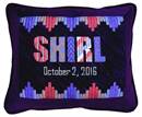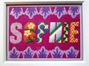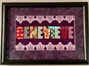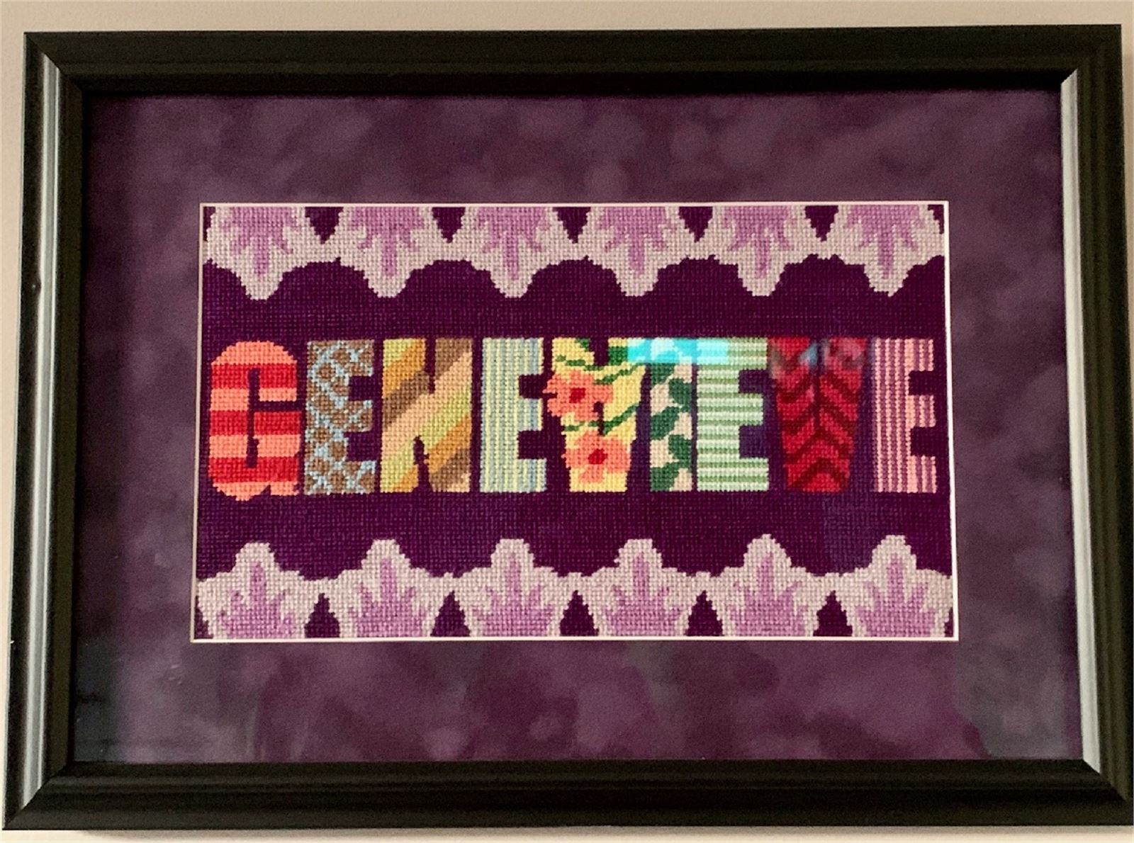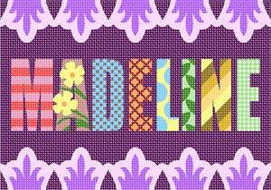 A person's name decorated with a variety of colorful patterns against a purple background. Coordinating floral flourishes on top and bottom frame out the art. Make sure to personalize this item with the name of your choice by clicking the "Customize" button above.