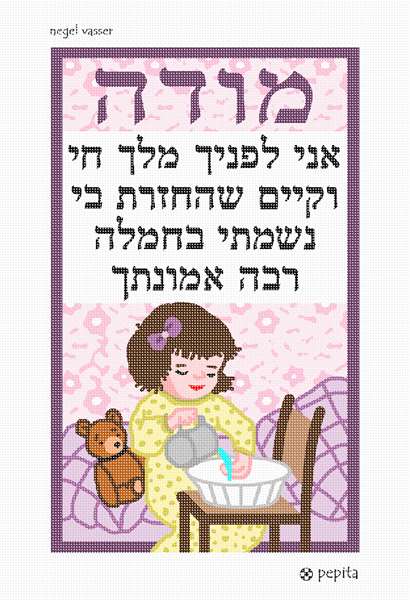 The "Modeh Ani" prayer is the first that is uttered by a Jew upon awakening in the morning. It thanks God for safekeeping and then returning the soul to my body. This needlepoint poster includes the prayer above an image of a sweet young girl washing her hands, in a ritual called "Negel Vasser", traditionally performed in the morning directly after getting out of bed.