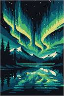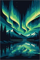 A mesmerizing display of the aurora borealis unfolds over a serene mountainous landscape, with vibrant waves of green and blue dancing across the night sky. The cool, luminous color palette evokes a sense of wonder and tranquility, capturing the ethereal essence of this natural phenomenon. Reflective waters below mirror the celestial spectacle above, enhancing the composition's visual symmetry.