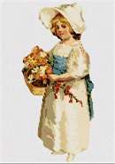 Olivia dressed in white satin and blue sash holds a fine arrangement of flowers in her hands.