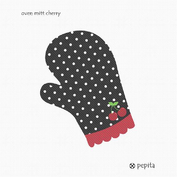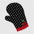 An oven mitt, polka-dotted black with a cherry icon near the bottom.