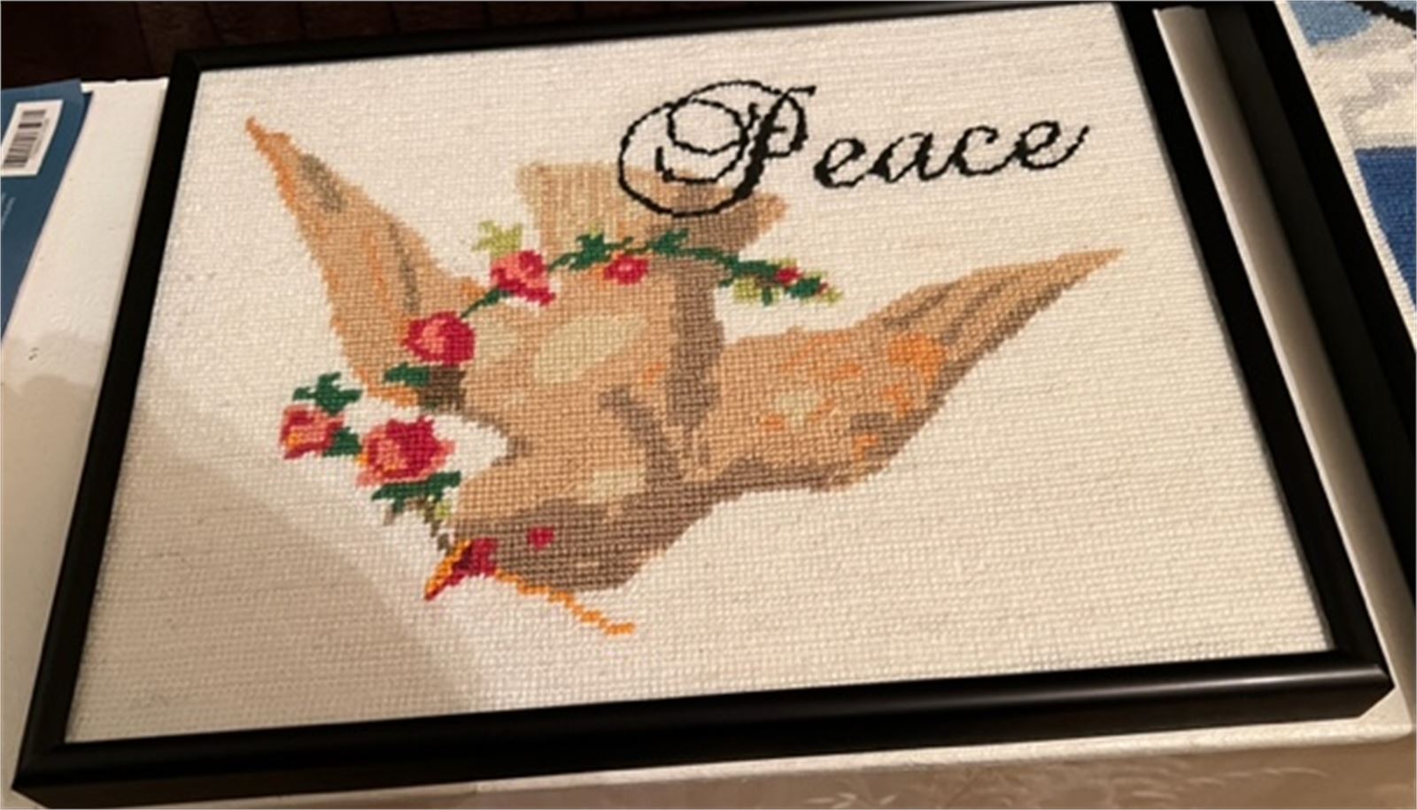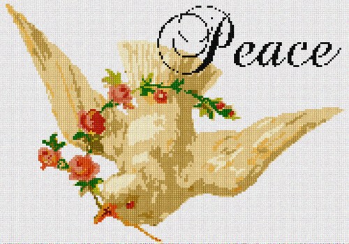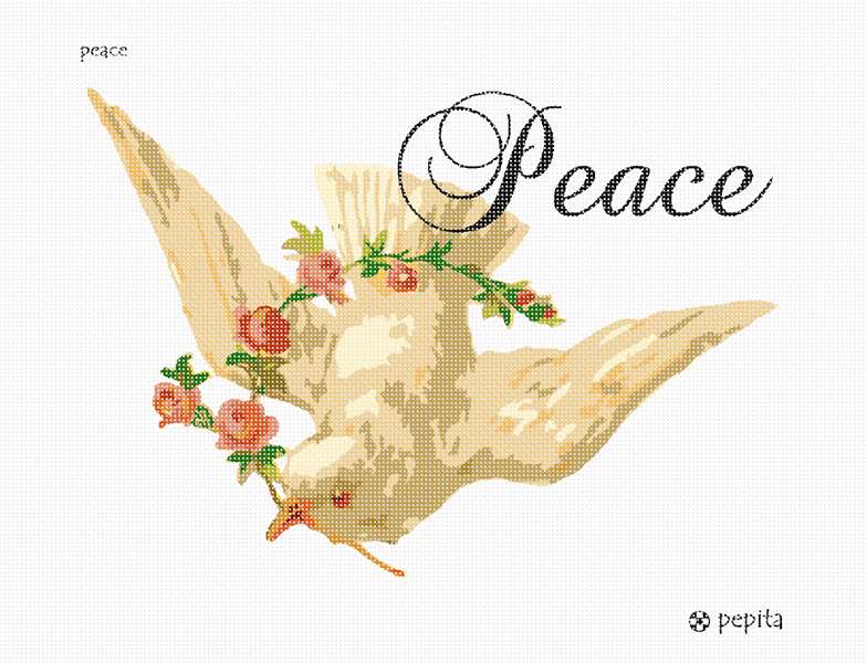 The timeless image of a dove in flight, carrying a branch of blooming floral color, conveys a message of universal friendship. The word Peace appears on the upper right in fancy cursive font.