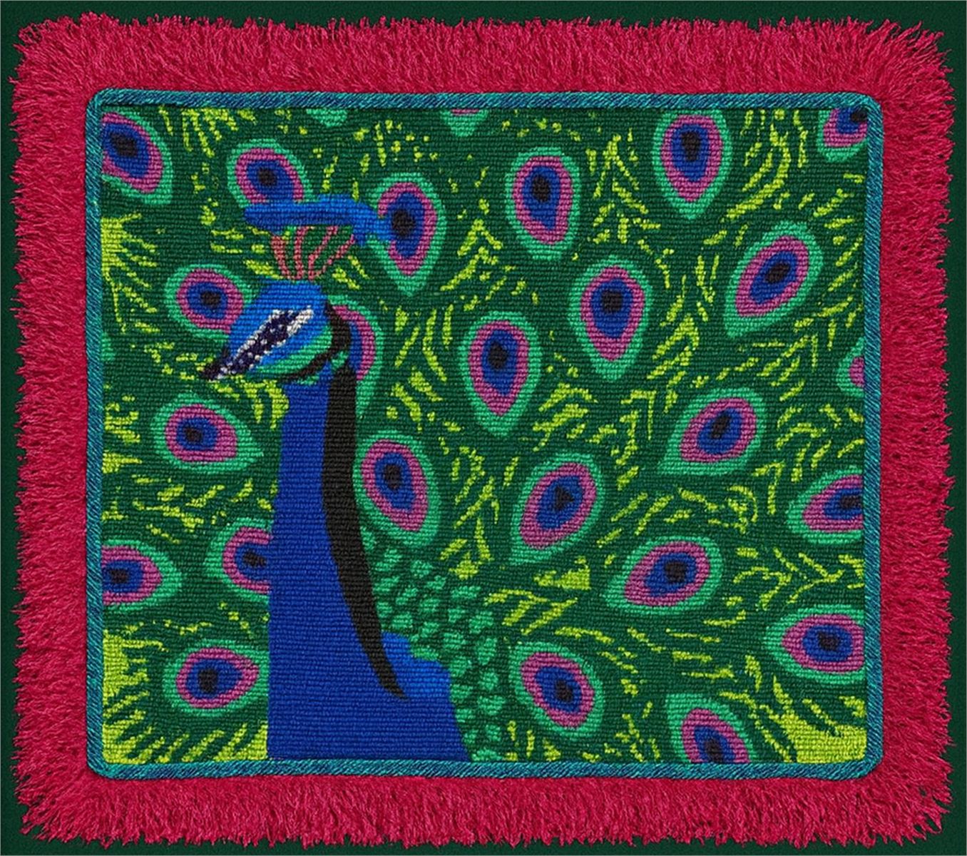 Royal blue with a backdrop of extravagant eye-spotted tail covert feathers. Proud as a peacock is an English simile. Peacocks are beautiful and a little show-offy. Their distinctive patterned feathers are their claim to fame.