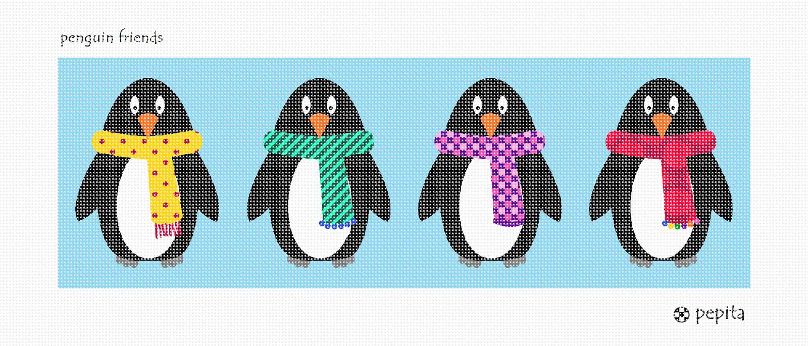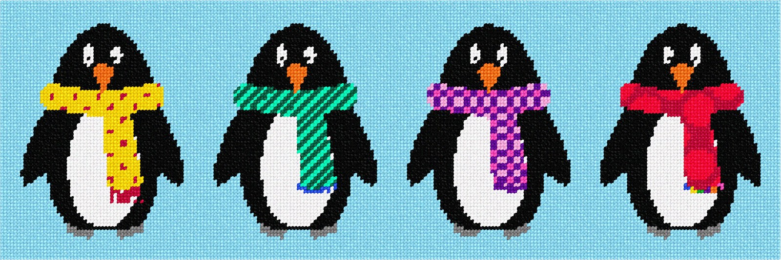 Patterned penguins in a row. Adorable and easy needlepoint!