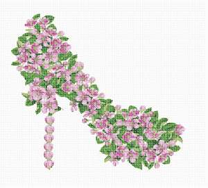Pink floral high heel shoe. Flowers and floral design are among the most popular needlepoint designs. People have been stitching flowers and floral motifs for hundreds of years. Flowers are bright and pleasant, and most have underlying meanings to them.