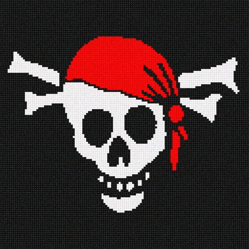 A whimsical depiction of the infamous flag flown by pirates from their mast to strike fear into merchant ships. A skull is wearing a red bandanna favored by outlaws, and is backed by two crossed bones. Aargh!