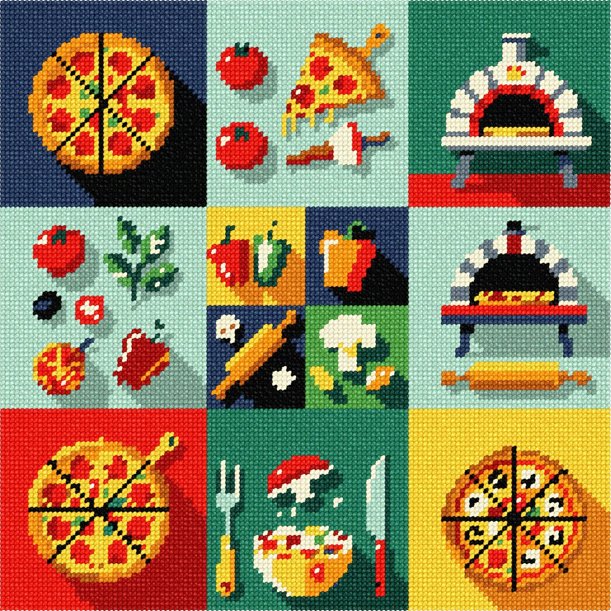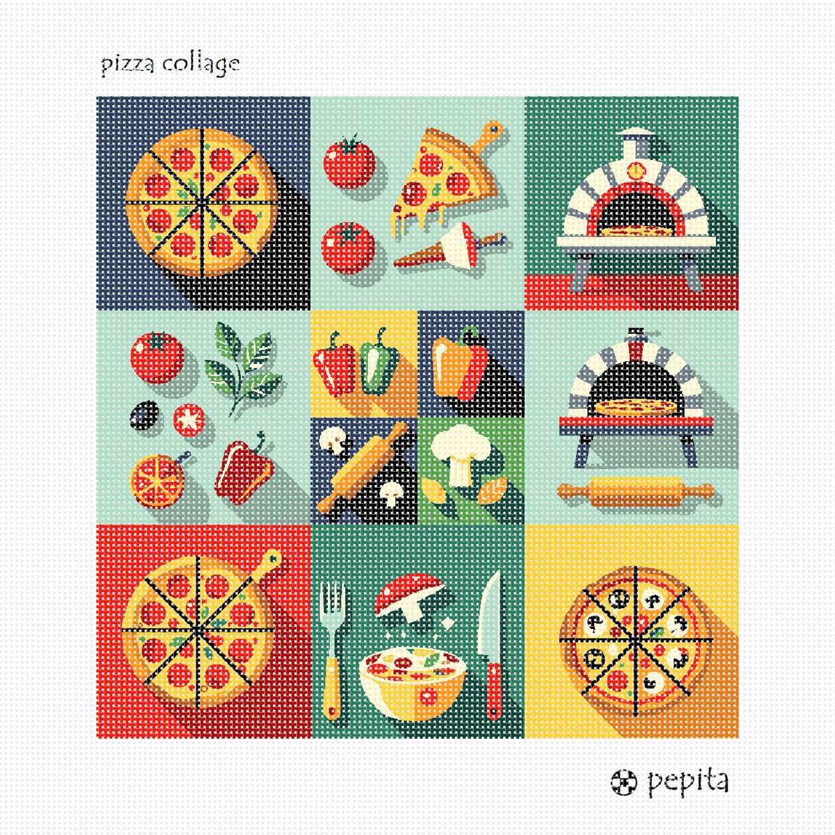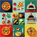 A vibrant pizza collage showcases various elements of pizza-making, from fresh tomatoes and peppers to an inviting brick oven. The image features a lively color palette dominated by reds, yellows, and greens, creating a cheerful and appetizing mood. The playful juxtaposition of ingredients and tools against different colored backgrounds adds a dynamic and modern flair.