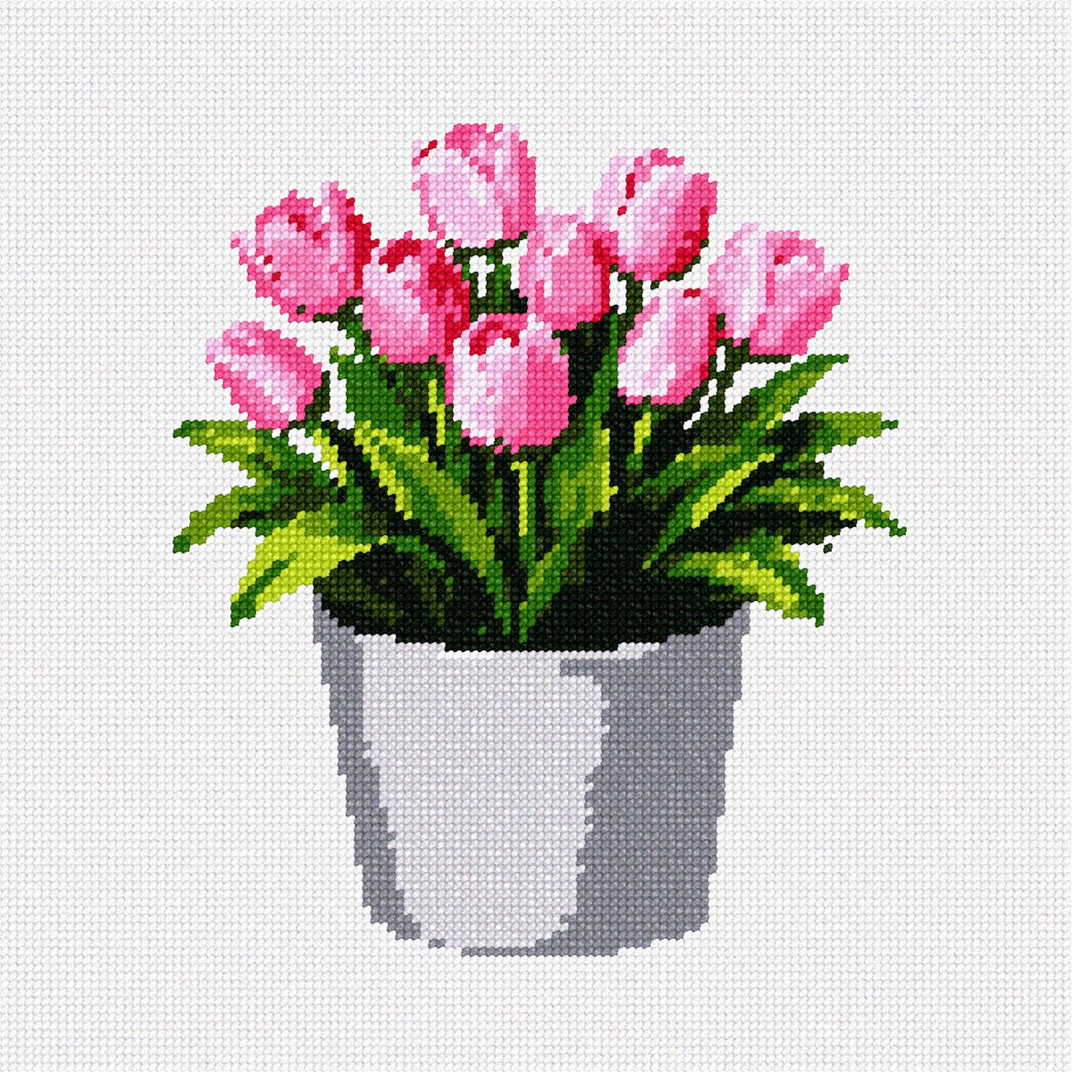 A vibrant pot of tulips takes center stage, showcasing delicate pink blooms and rich green leaves. The soft pastel palette evokes a serene and cheerful ambiance, enhancing its elegant style. Perfectly balanced composition draws attention to the graceful arc of the blossoms, adding sophistication to any setting.