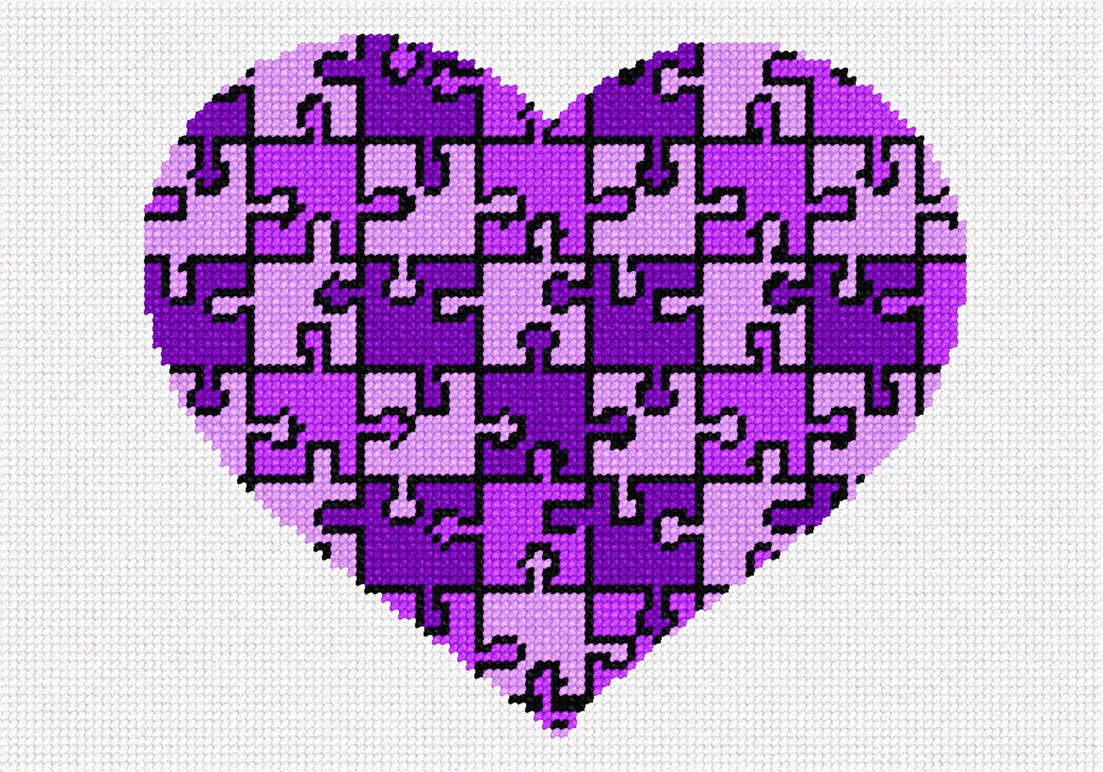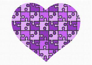A heart puzzle in shades of purple. No one knows why the heart is associated with love. A human heart weighs between 7 and 15 ounces. Our heart beats around 100,000 times a day. Laughing is good for your heart. A “broken heart” can feel like a heart attack.
