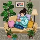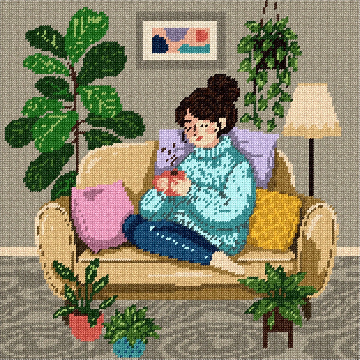 A serene scene unfolds with a woman in a cozy sweater, cradling a cup on a plush sofa surrounded by vibrant greenery. The harmonious color palette features soft earth tones with splashes of blue, green, and lavender, creating a warm and inviting atmosphere. Thoughtful composition includes elegant plants and ambient lighting, enhancing the tranquil, homey vibe.