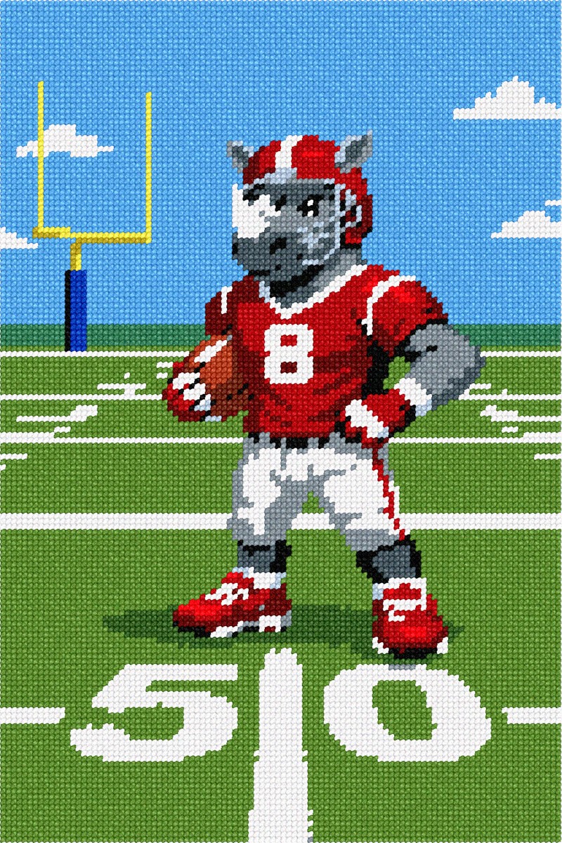 A dynamic rhino character in a vivid red football uniform stands confidently on the green turf at the 50-yard line, clutching a football. The bright palette of red, green, and blue against a clear sky creates an energetic and playful mood. Cartoonish styling with crisp lines emphasizes the rhino's determined expression and athletic stance, adding a touch of whimsy to the scene.