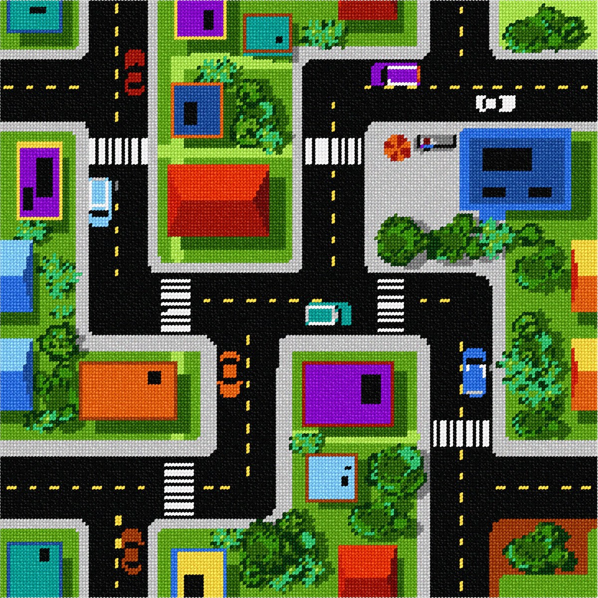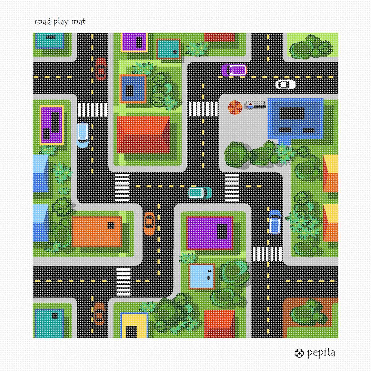 Stitch a road traffic map of city life play mat. They actually sell these oversized carpet mats for kids to play on. This is a smaller version and perfect for a tabletop toy.