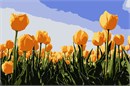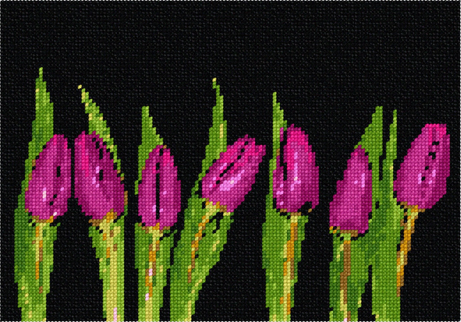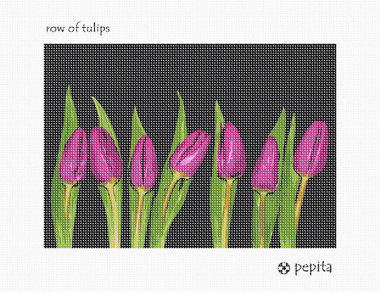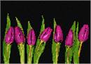 Seven tulips on display. Real live tulips bloom once a year. Tulip needlepoints can be enjoyed throughout the year. Red tulips are most strongly associated with true love, while purple symbolizes royalty. The meaning of yellow tulips has evolved somewhat, from once representing hopeless love to now being a common expression for cheerful thoughts and sunshine.