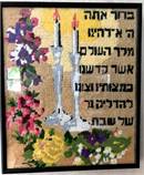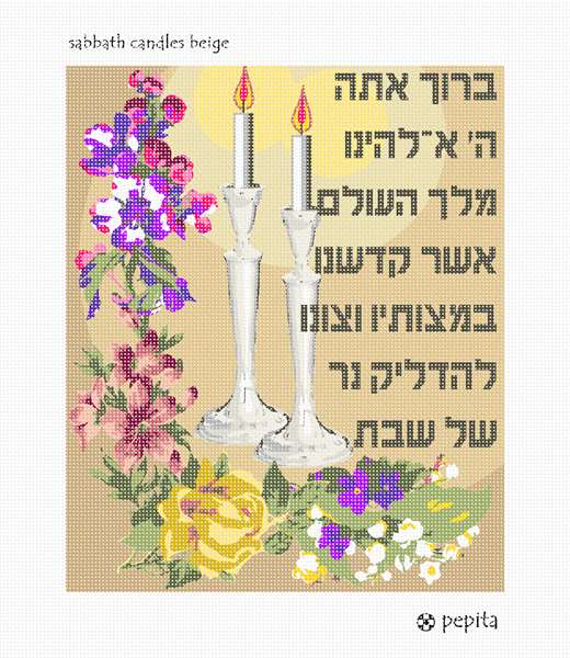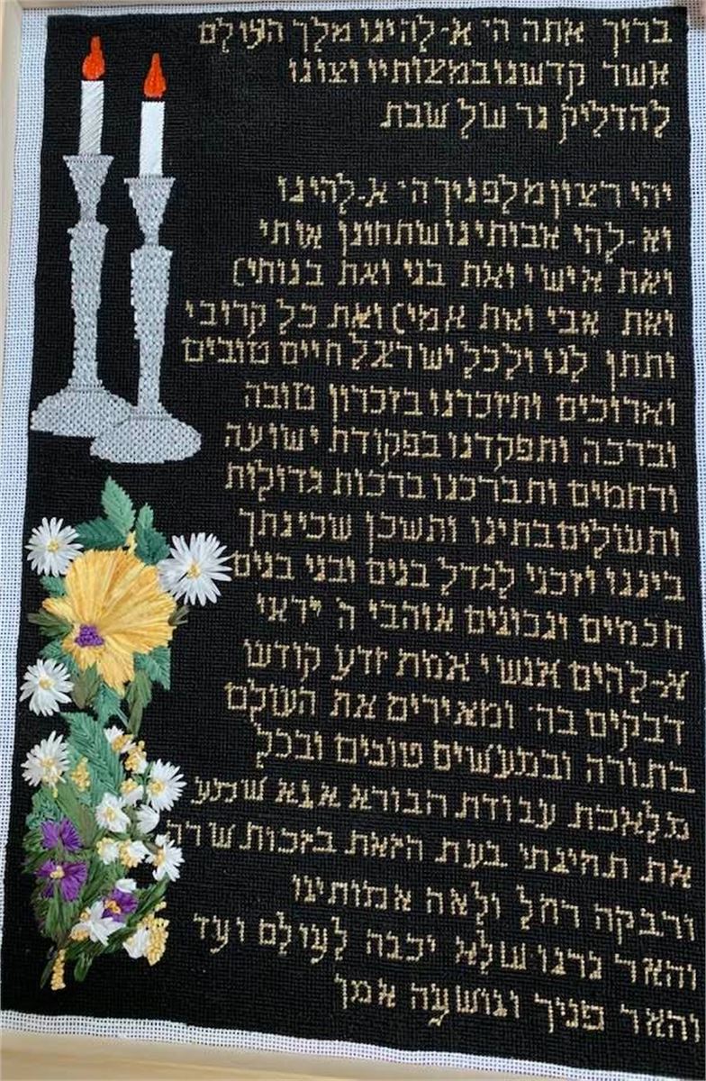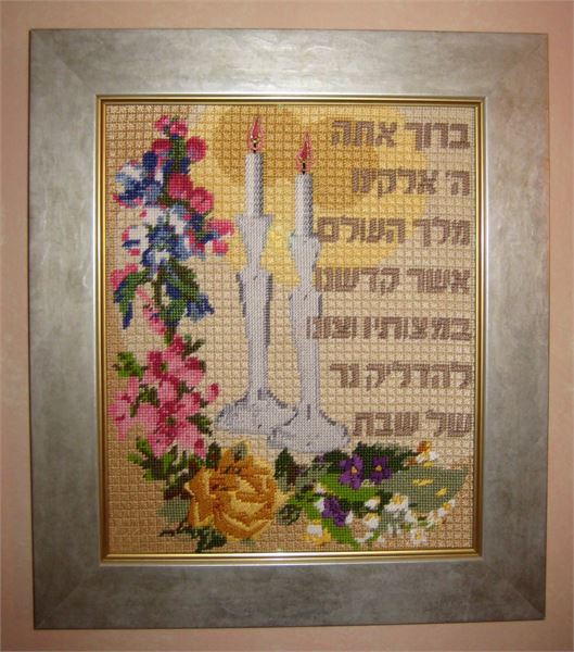 Two gleaming silver Sabbath candlesticks, framed in flowers and a Hebrew blessing. It's a special and sacred time for the Jewish woman when she lights the candles every Friday night to usher in the Shabbos. It is a time when she can pray for anything, and her prayers are heard by the One Above. Flowers and floral design are among the most popular needlepoint designs. People have been stitching flowers and floral motifs for hundreds of years. Flowers are bright and pleasant, and most have underlying meanings to them.