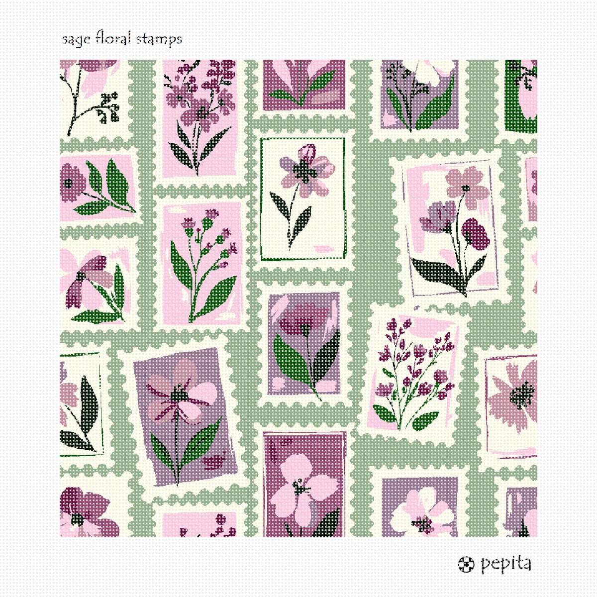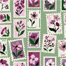 Based on vintage postal stamps, this design features floral stamps in shades of pinks on a sage green background.