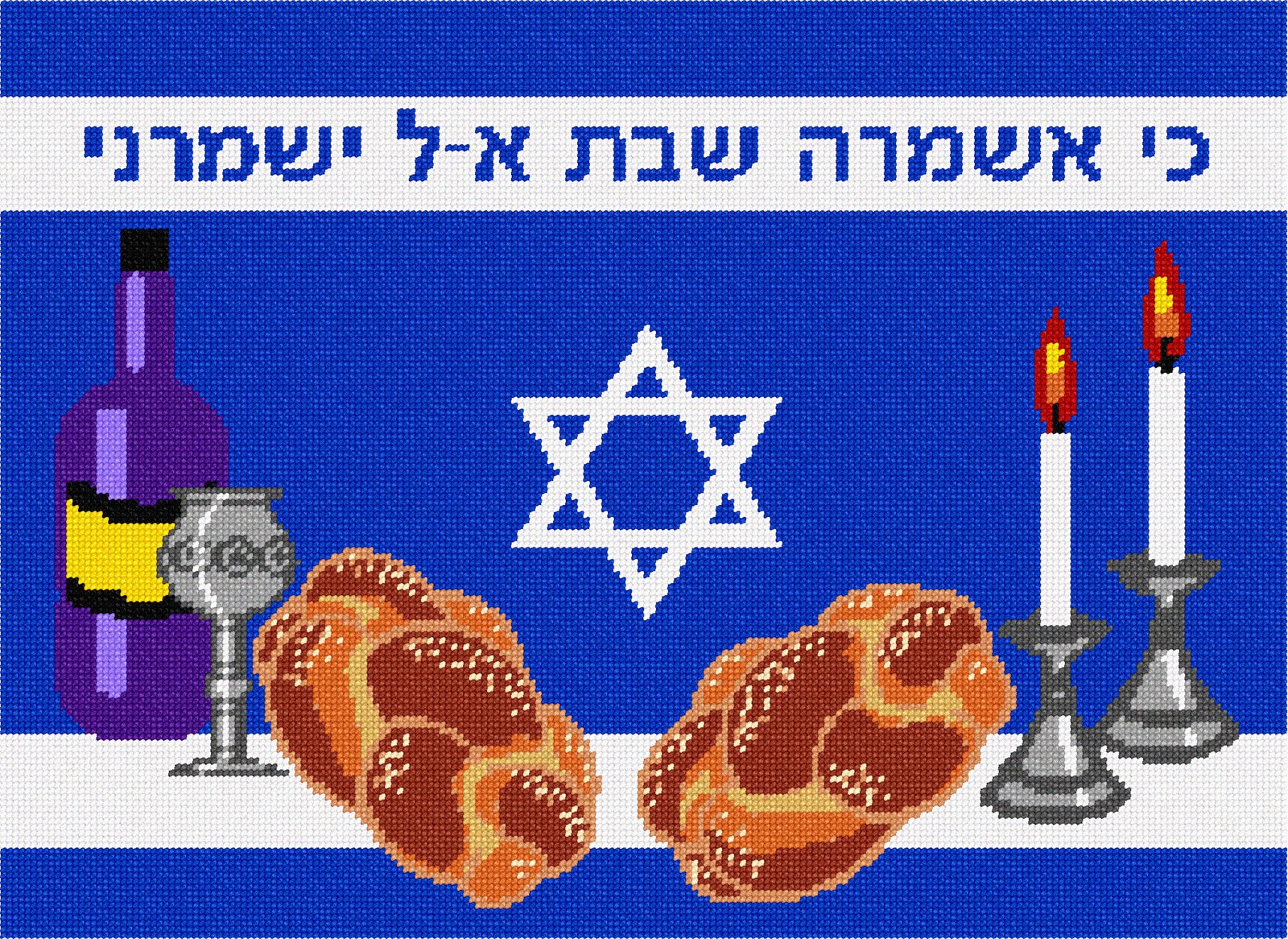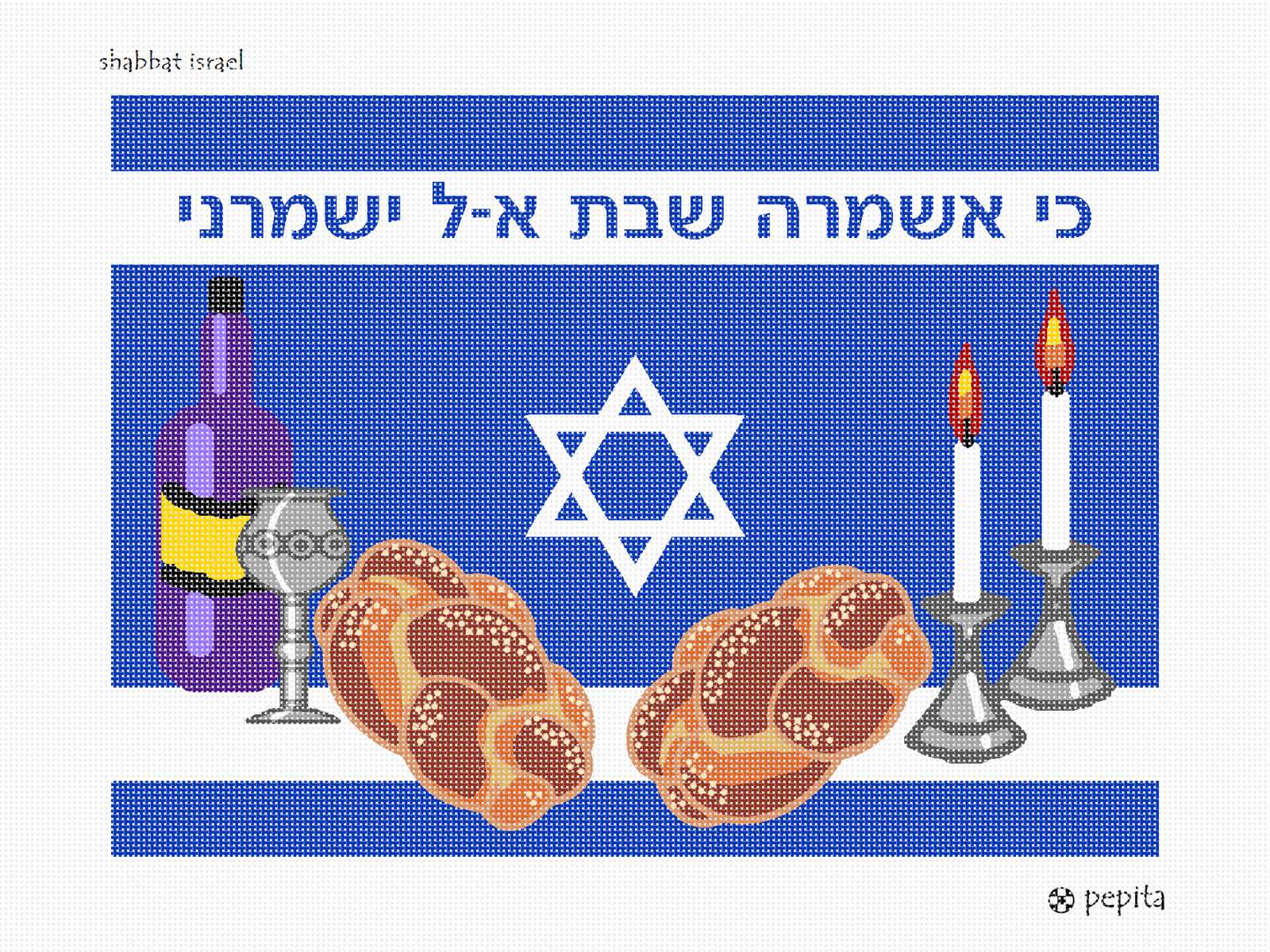 These Hebrew words mean that if I keep Shabbat, G-d protects me. And it is really true! In these turbulent times, stitch this as a wall hanging or challah cover. The Isreali flag colors are reversed for vibrancy. Two challahs, two candlesticks, wine, and kiddush cup adorn this needlepoint design. Let us all pray for peace and protection.