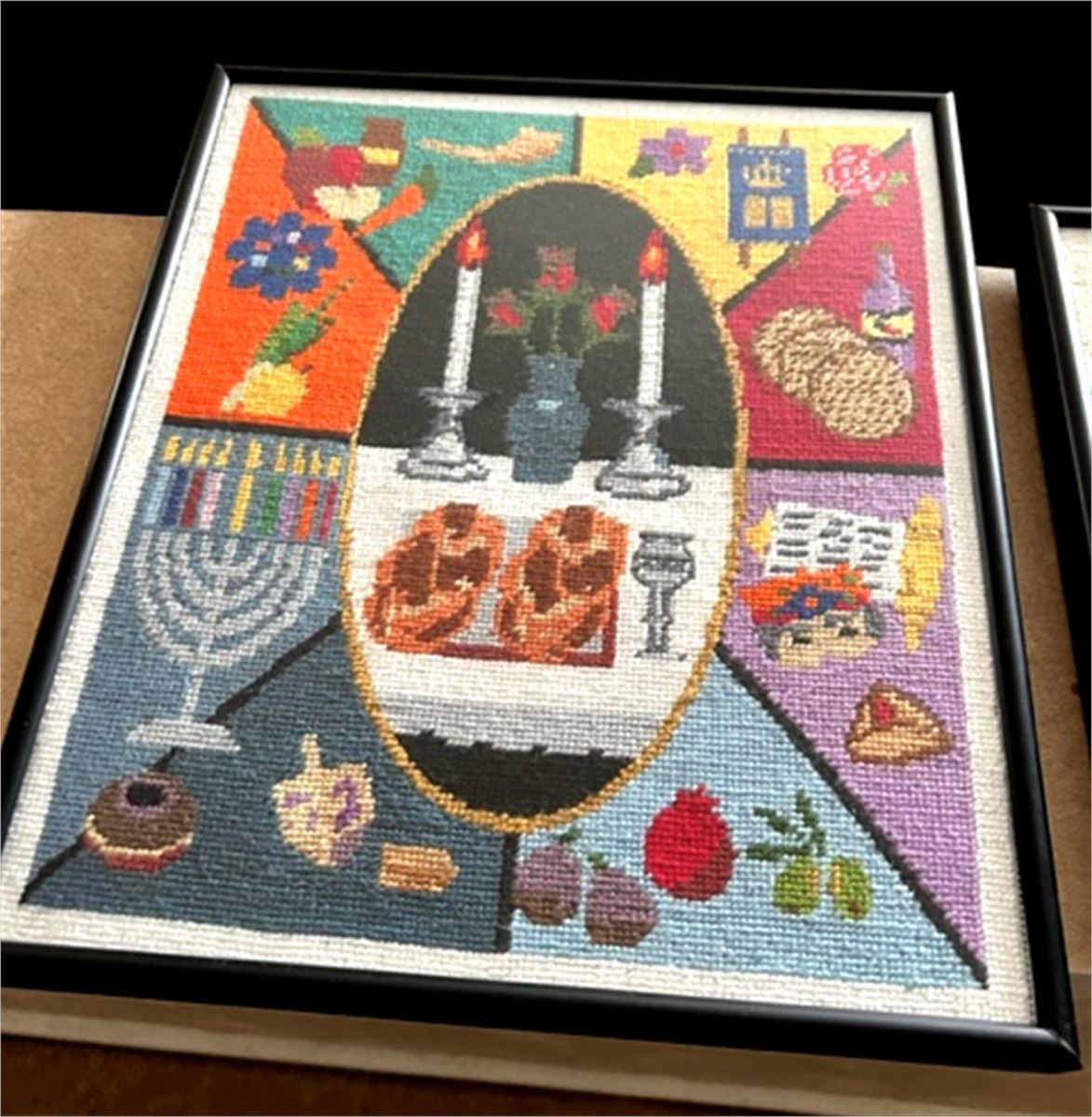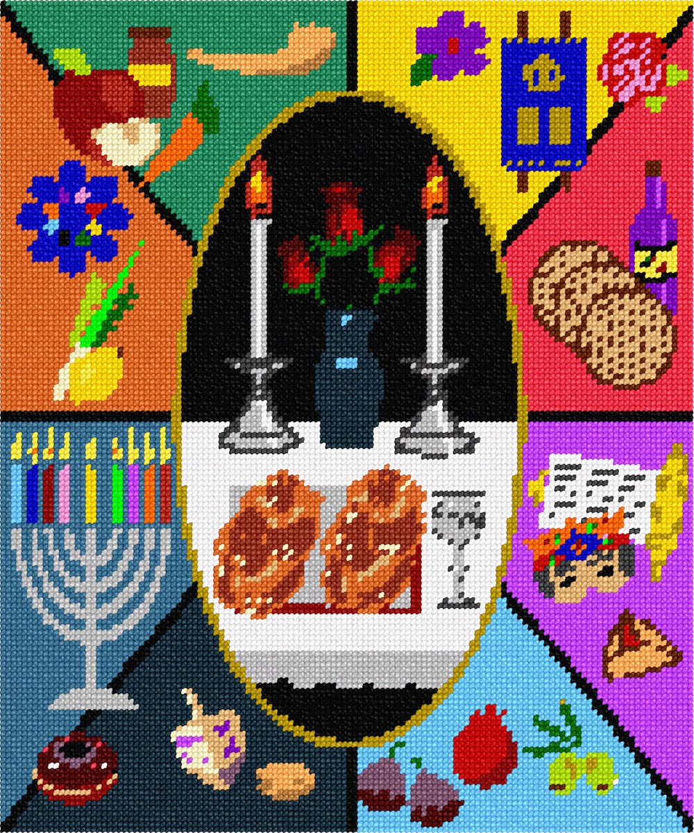 Celebrate Shabbat and the Jewish Holidays with this collage of judaica items. The center is set as a Shabbos table adorned with a white tablecloth, candlesticks, a vase of flowers, challahs, and a kiddush cup. It is surrounded by holiday items such as a Lulov and esrog for Sukkos, Matzoh, and wine for Pesach, apple, honey, shofar, and carrot for Rosh Hashana, a Megillah and mask for Purim, a Sefer Torah and flowers for Shavuos, and a Menorah, donut, and draidel for Chanukah. All around the year and Hebrew calendar, this hamsa is timeless and fun.