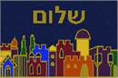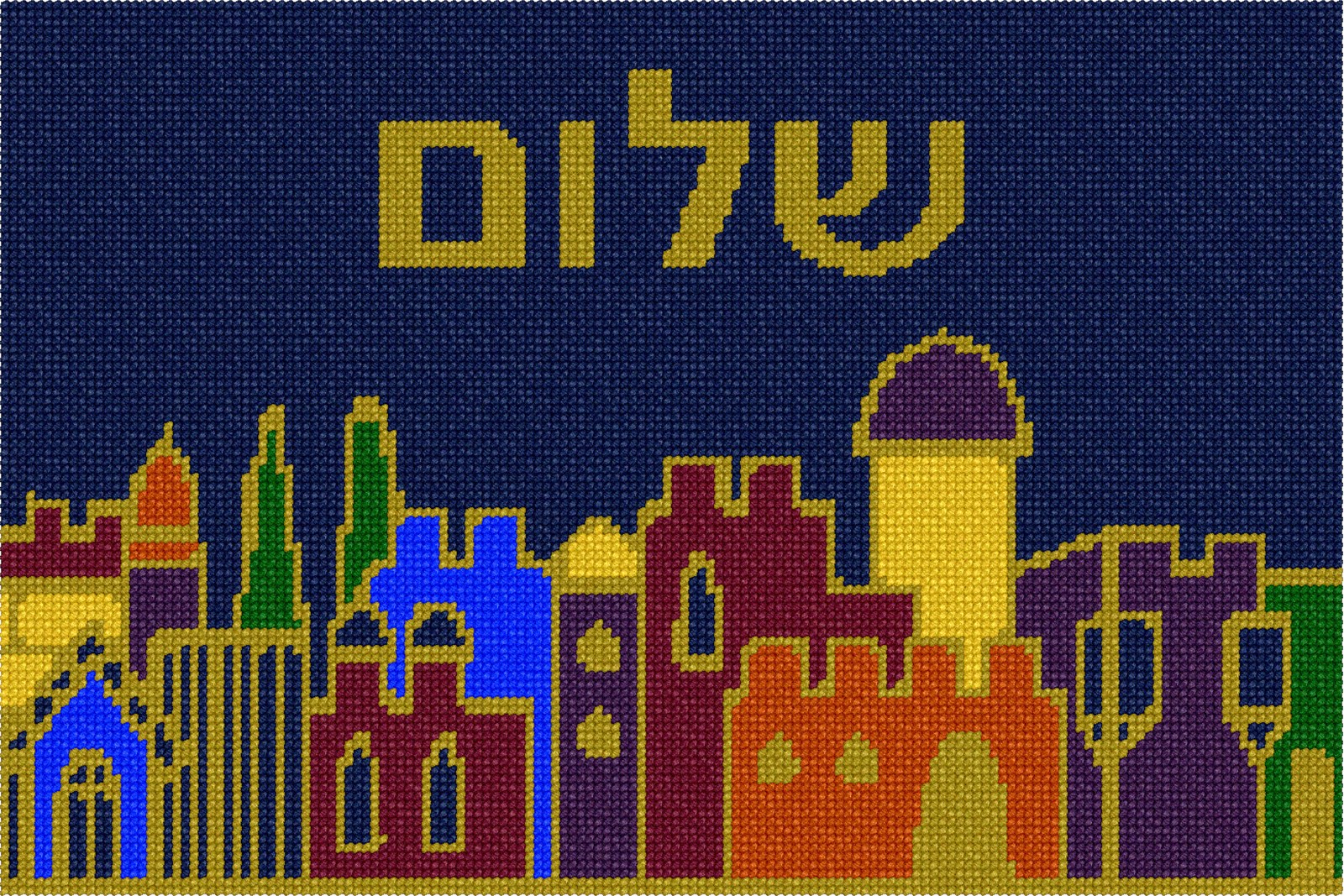 The Jerusalem skyline at night with the word "Shalom" in gold. Jerusalem designs are very popular in judaica needlepoint. Everyone needs a peace sign or symbol hanging on the walls of their houses. We need a daily reminder of how important it is to live peacefully and in harmony with one another.