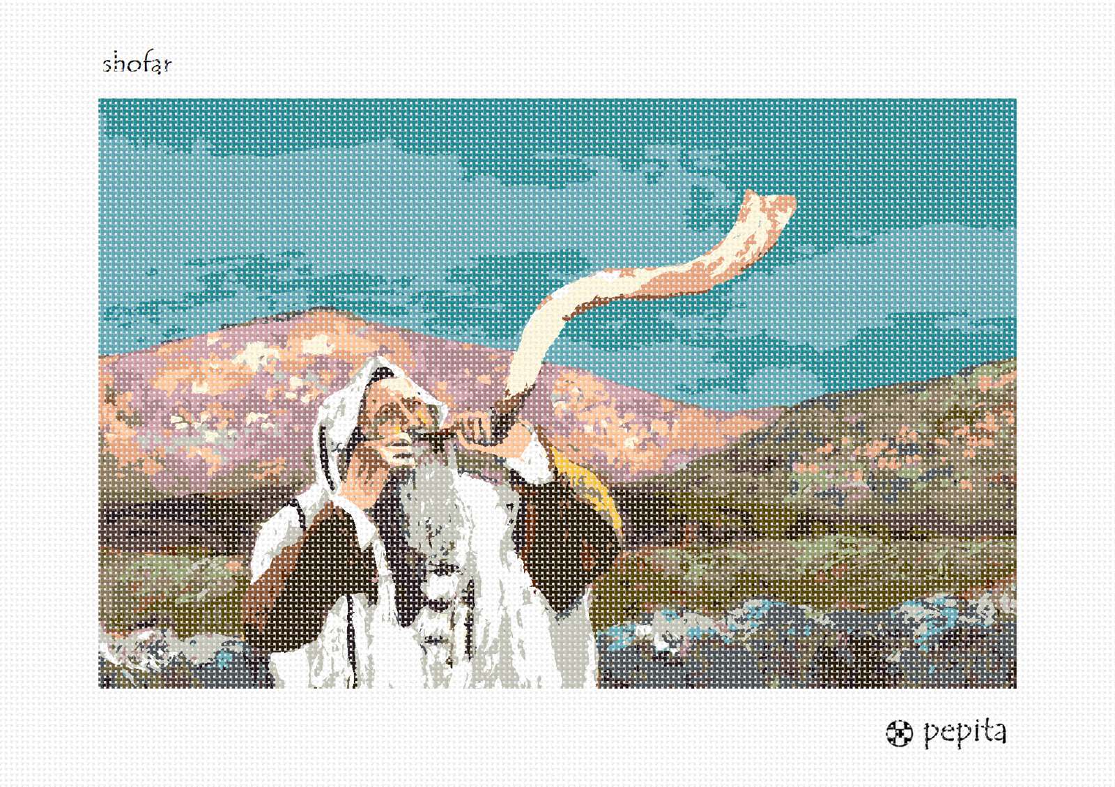 Original artwork by Nechama Shaish available in needlepoint. Just in time for Elul and Rosh Hashana. This scene depicts a Rabbi blowing shofar with the hills of Jerusalem in the background.