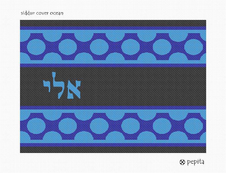 Siddur cover in ocean colors. See coordinating tefillin and tallit bag. A perfect ensemble. Many mothers and grandmothers stitch tefillin and tallit bags for the boys. They stitch siddur covers for the girls. Many schools have siddur ceremonies where the siddur cover is custom made.