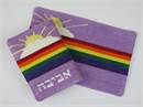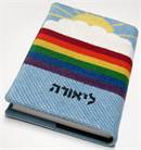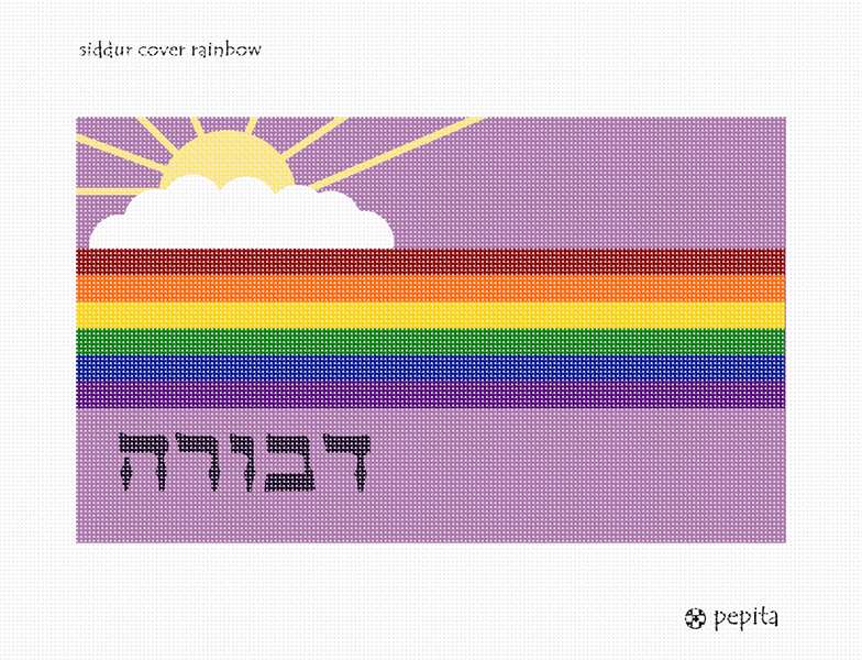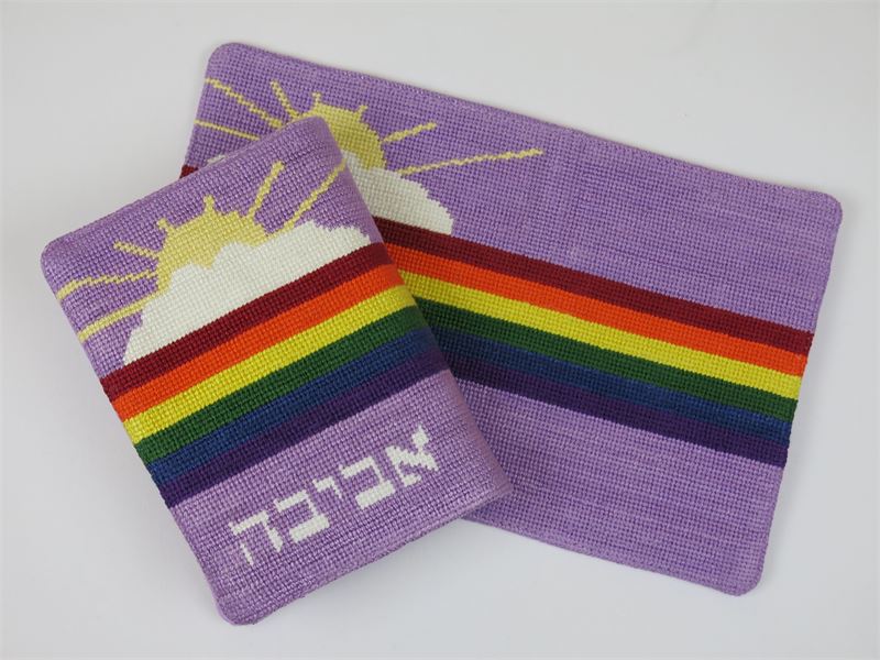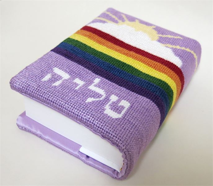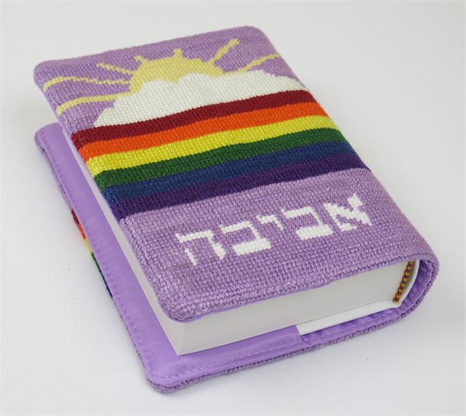 Against a rich violet background: a rainbow stripe, clouds and sun, personalized with a name. Many mothers and grandmothers stitch tefillin and tallit bags for the boys. They stitch siddur covers for the girls. Many schools have siddur ceremonies where the siddur cover is custom made.