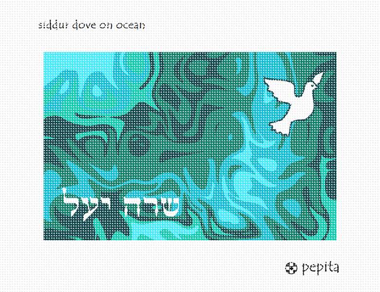 Swirling ocean eddies in marine colors, and a white dove. Many mothers and grandmothers stitch tefillin and tallit bags for the boys. They stitch siddur covers for the girls. Many schools have siddur ceremonies where the siddur cover is custom made.