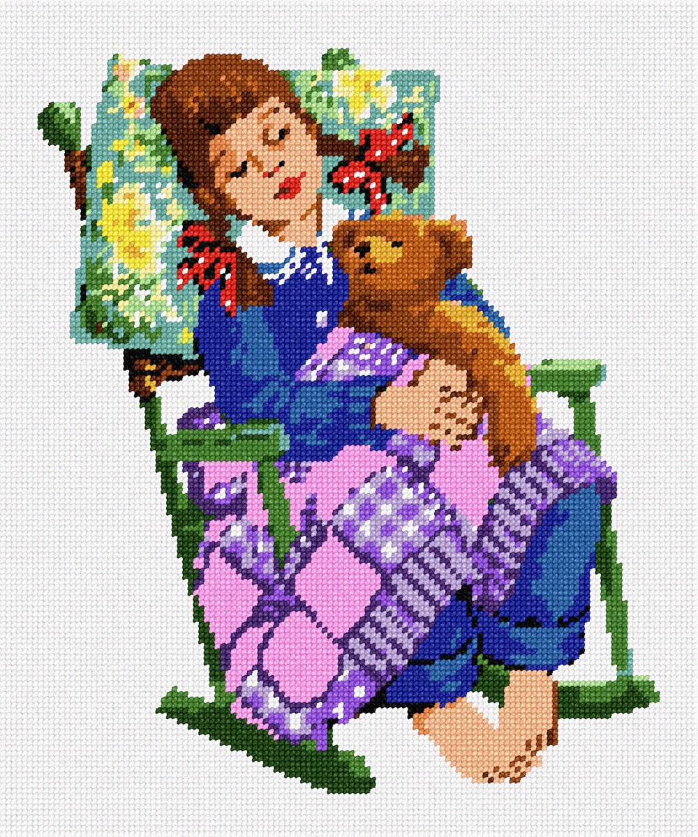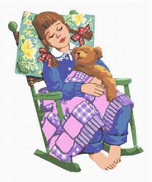 A cherubic girl is dozing with her teddy on a green rocking chair. Her braided hair is adorned with red and white polka dot ribbon bows. She is covered in a patchwork quilt, and her head is resting on a floral pillow.