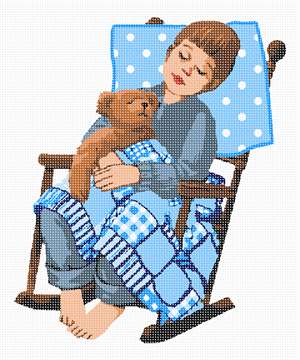 A little boy is dozing with his teddy on a wooden rocking chair. He is covered in a patchwork quilt, and his head is resting on a polka dot pillow.