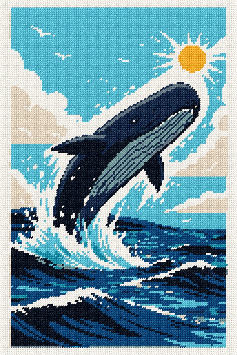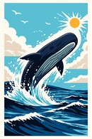 A majestic sperm whale breaches the vibrant ocean waves, dominating the scene with its grandeur and elegance. The palette features a stunning blend of deep blues and crisp whites, set against a sunlit sky that evokes a sense of awe and exhilaration. Playful composition elements, such as soaring seagulls and dynamic water splashes, add a lively and captivating dimension to the artwork.