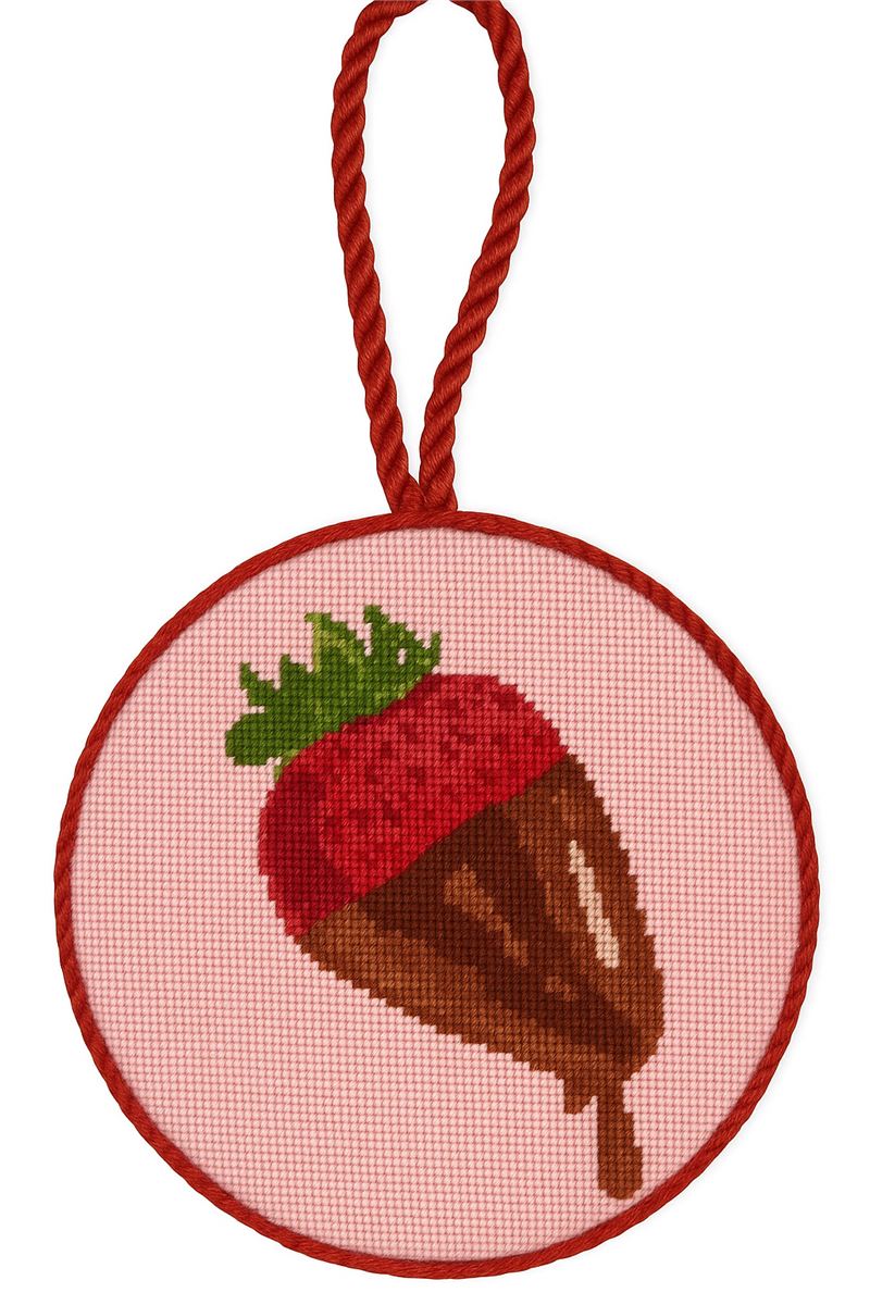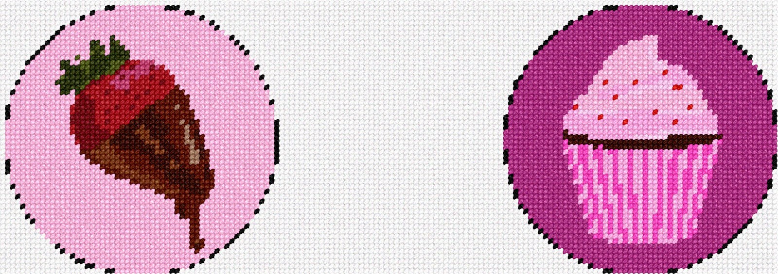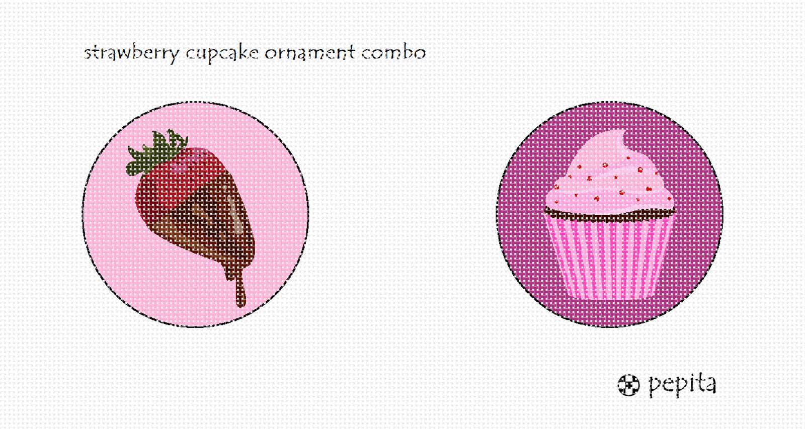 New! Pepita now designs ornaments. These are paired and sold as a set. This one has an chocolate dipped strawberry ornament and a strawberry cupcake ornament. Stitch two for the price of one. 18 mesh