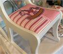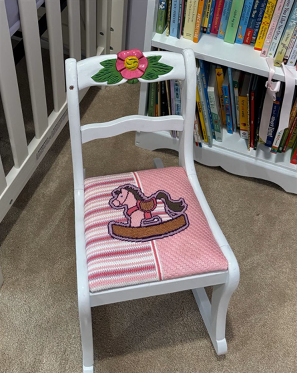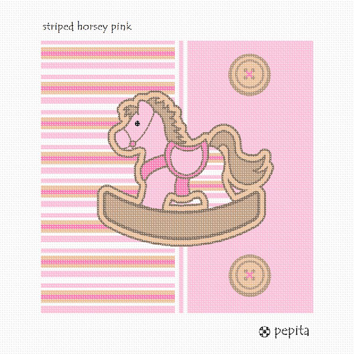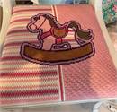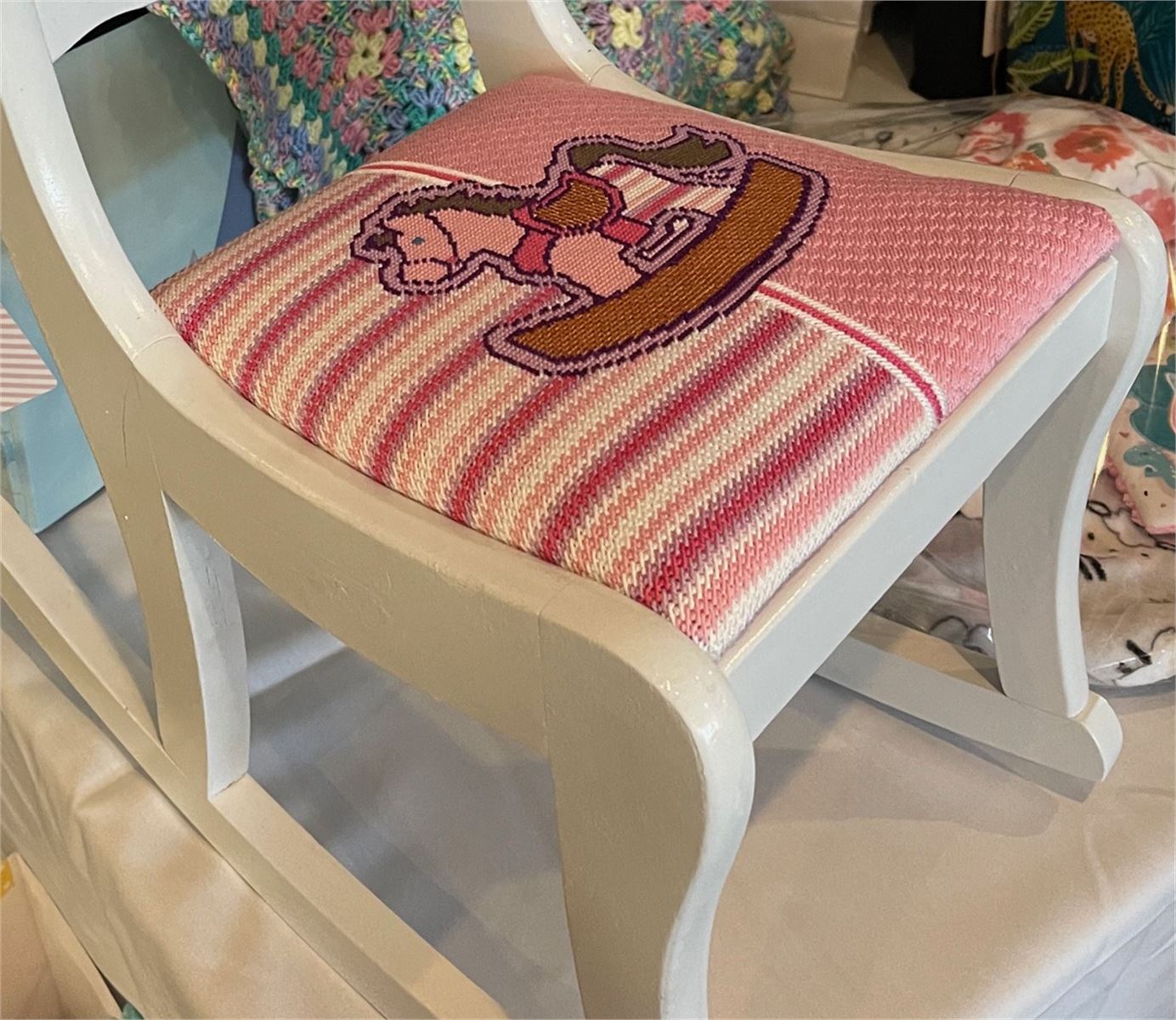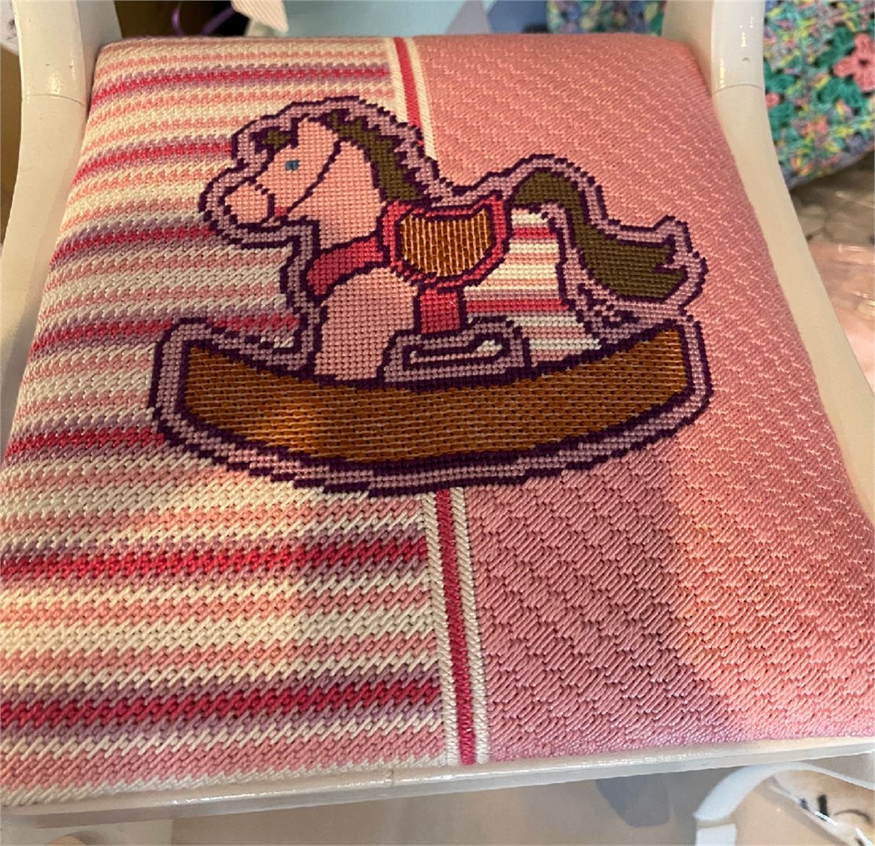 Soft pastel blue and brown stripes on one side - solid blue and cute buttons on the other side - and the sweetest rocking horse smack in the middle. When this piece is done you'll almost want to try it on.