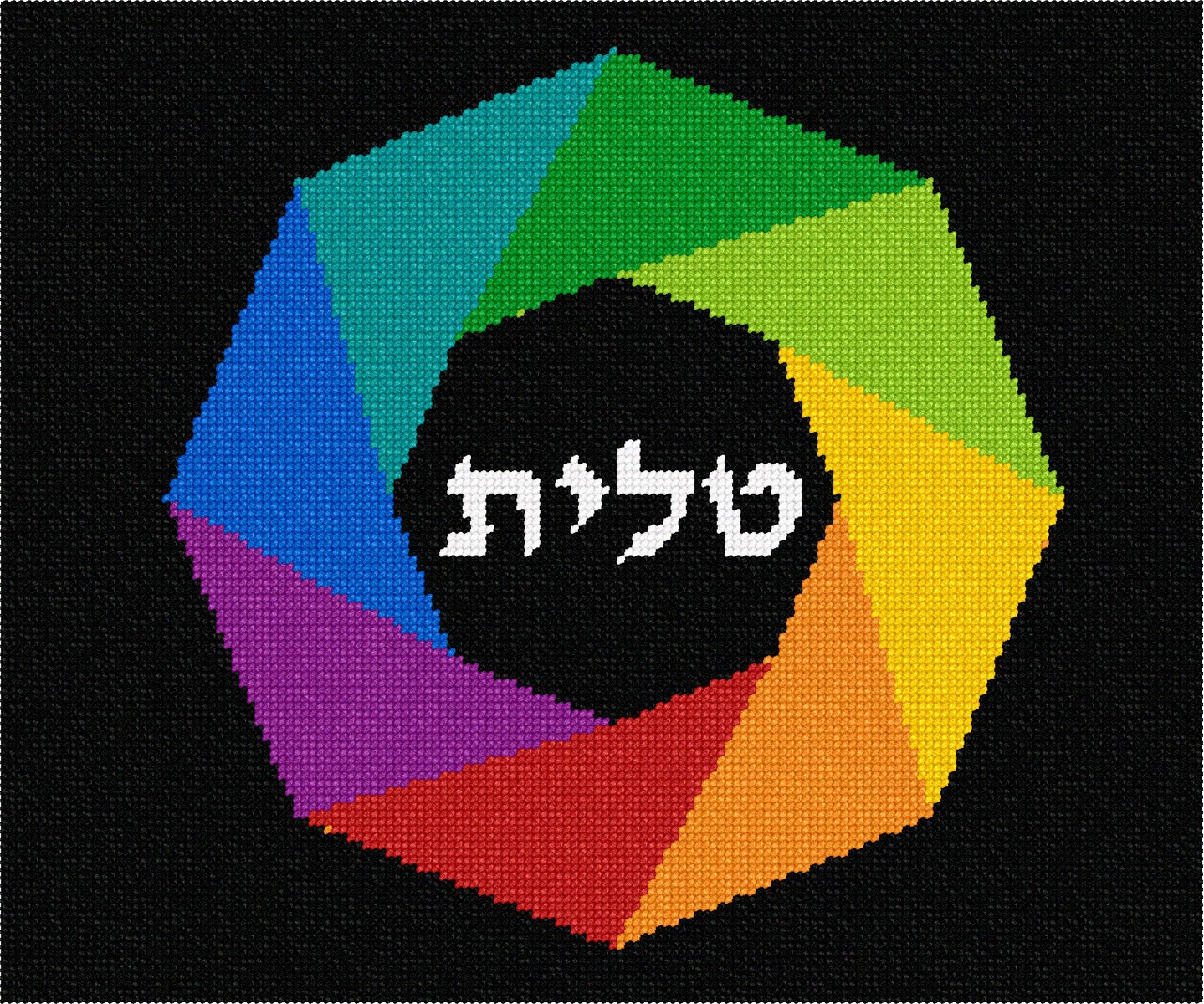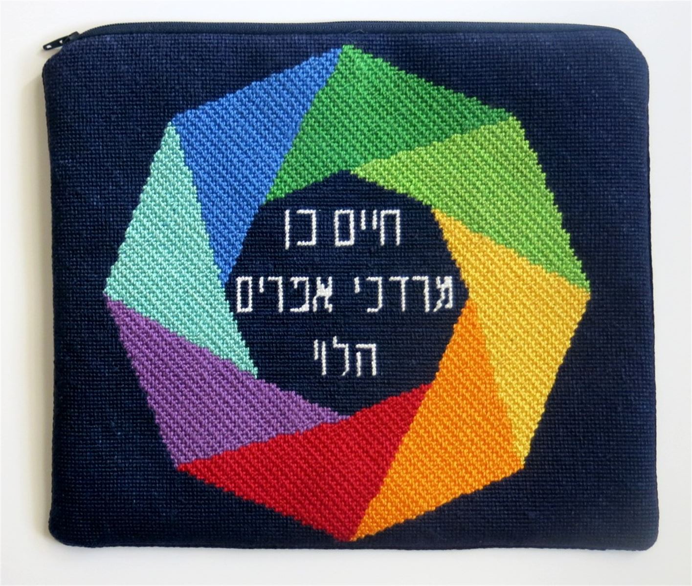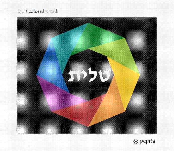 A colorful tallit bag design with a wreath in the center. This is a modern, neat design. You stitch the front. After it is completely stitched, it is sent to a professional finisher who adds a lining, back, and matching zipper.There is a matching tefillin bag available for this design.