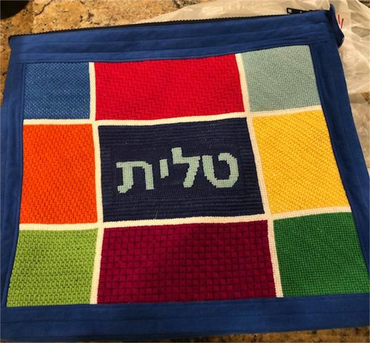 Color is in with this tallit bag. This is a modern, neat design. You stitch the front. After it is completely stitched, it is sent to a professional finisher who adds a lining, back, and matching zipper.There is a matching tefillin bag available for this design.
