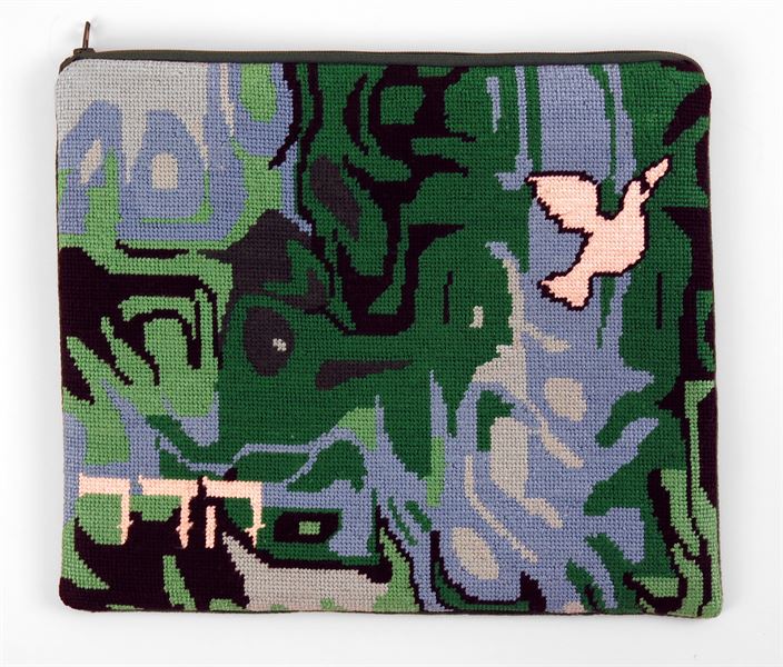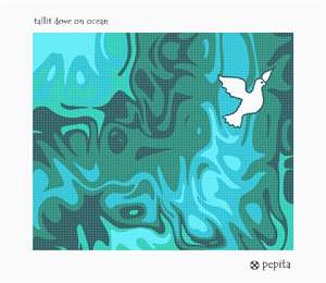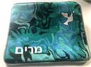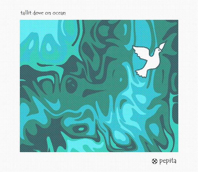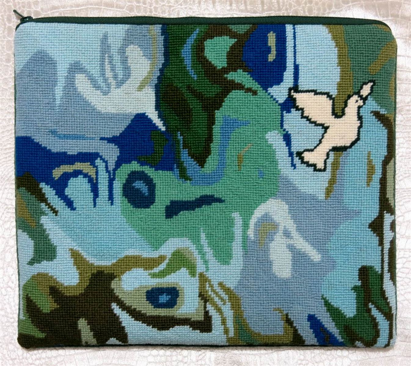 Swirling ocean eddies in marine colors, and a white dove. This is a modern, neat design. You stitch the front. After it is completely stitched, it is sent to a professional finisher who adds a lining, back, and matching zipper. There is a matching siddur cover available for this design.