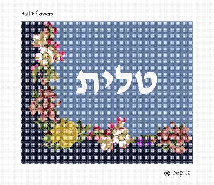 Rich blue tallit design with festive flowers. You stitch the front. After it is completely stitched, it is sent to a professional finisher who adds a lining, back, and matching zipper. See matching challah cover.