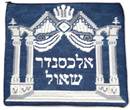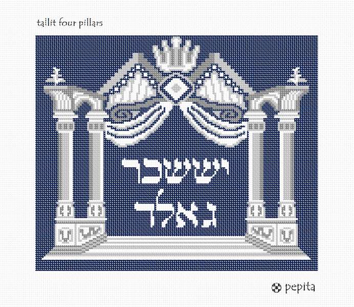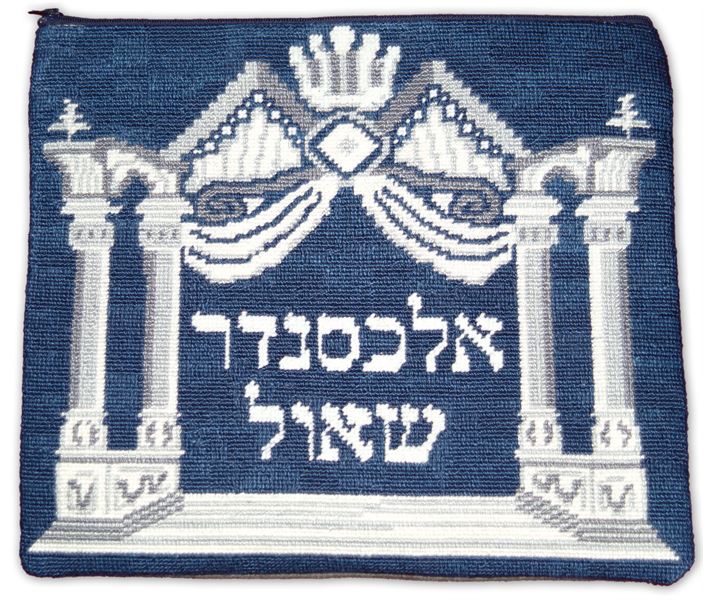 This special design was first conceived in the 19th century and printed on the title page of the Vilno Talmud. For the first time, it has been adapted for needlepoint Tallit bags. Four pillars support an arch with drapes, topped by a crown, on an etched floor. Shades of silver against navy blue. Space for custom text provided in the center area.