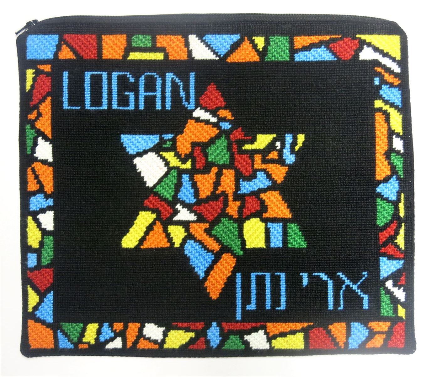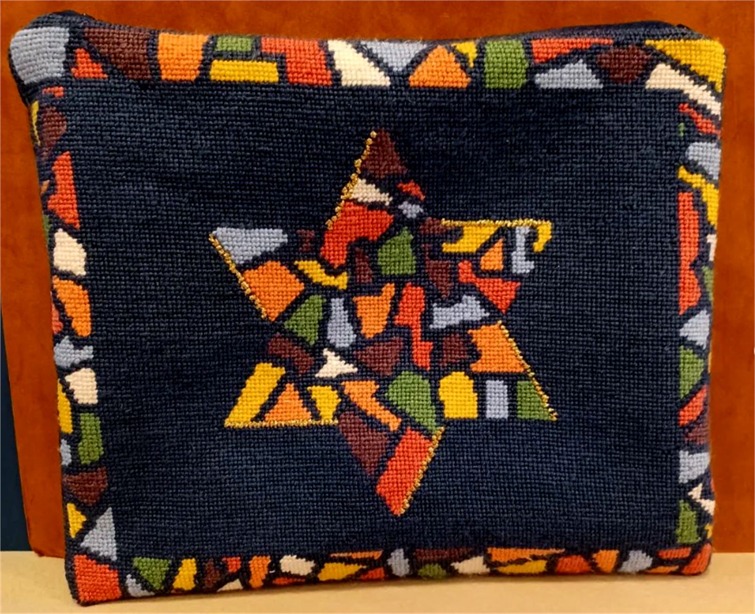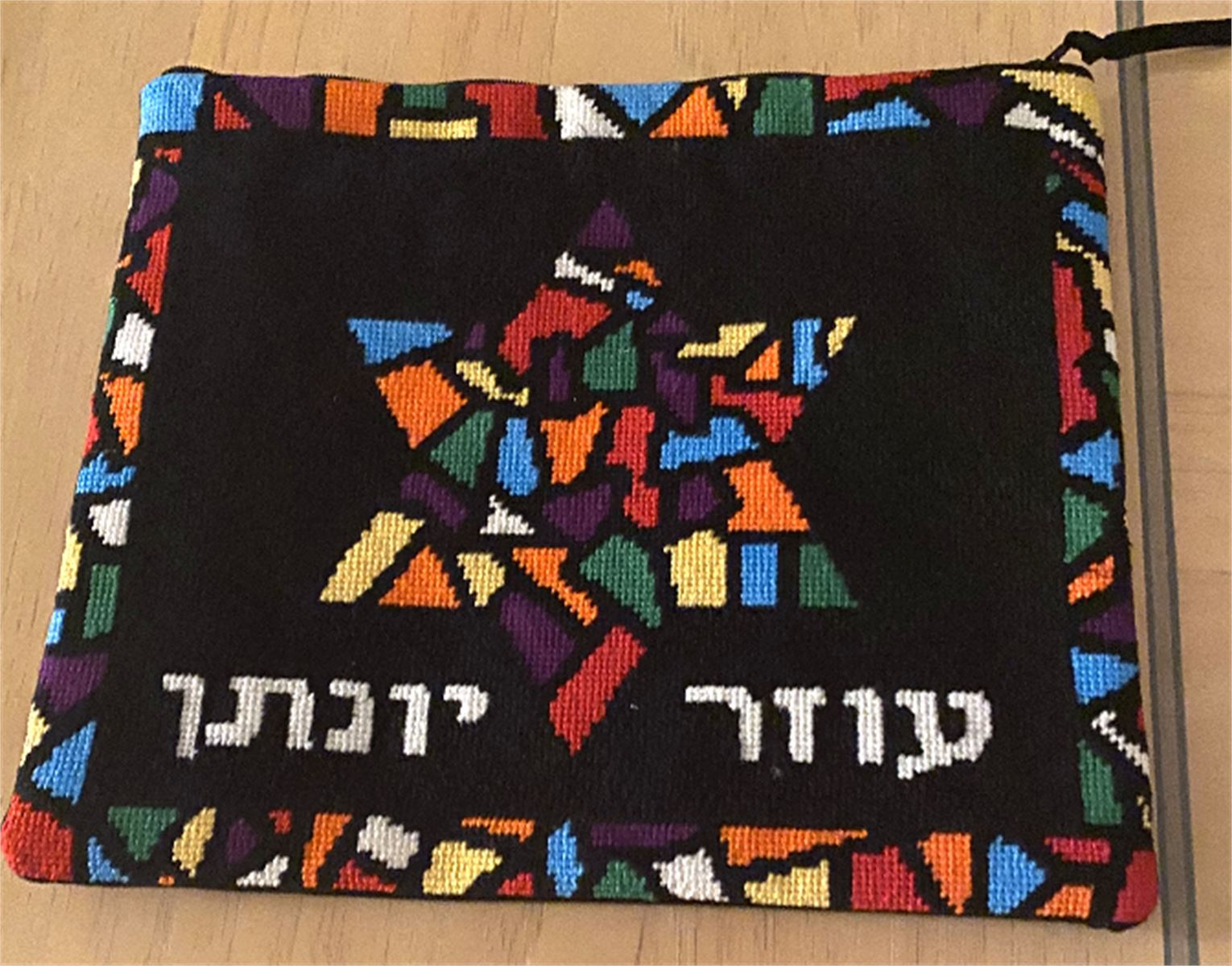 Are you a stained glass fan? This tallit bag is for you. This is a modern, neat design. You stitch the front. After it is completely stitched, it is sent to a professional finisher who adds a lining, back, and matching zipper.There is a matching tefillin bag available for this design.