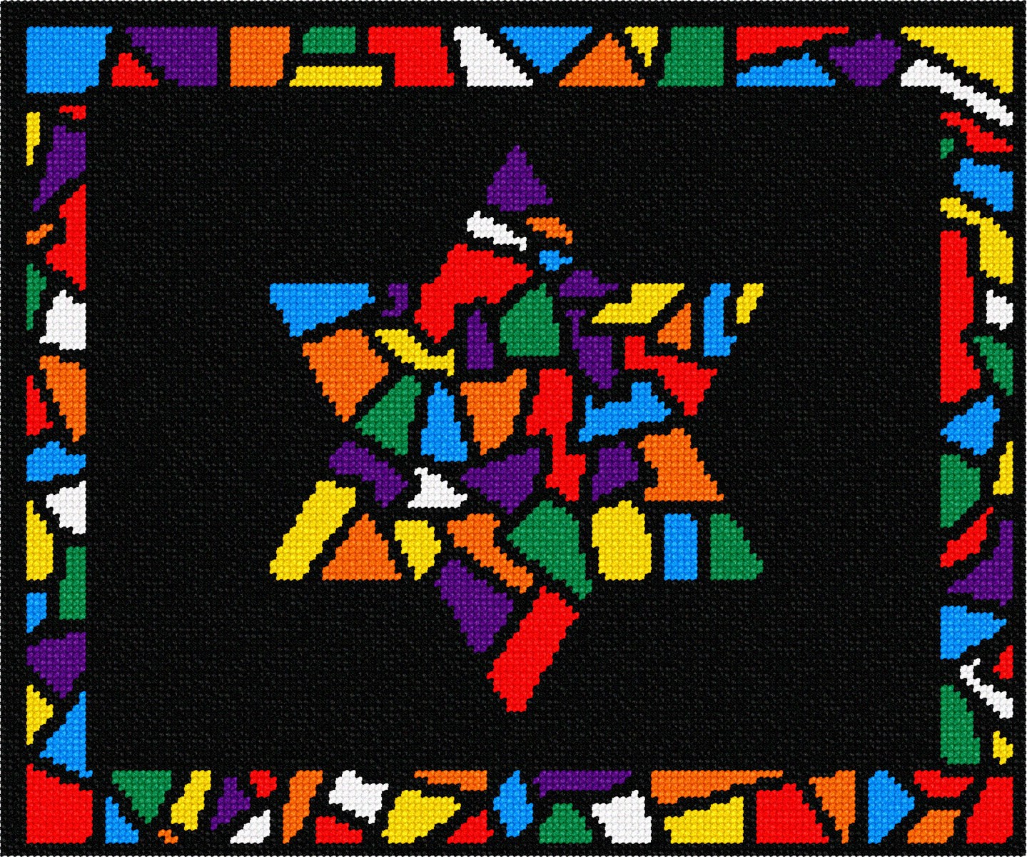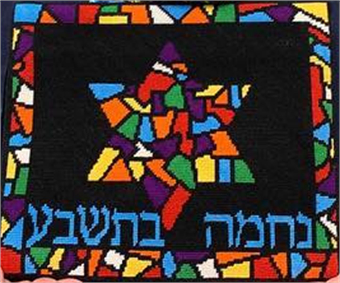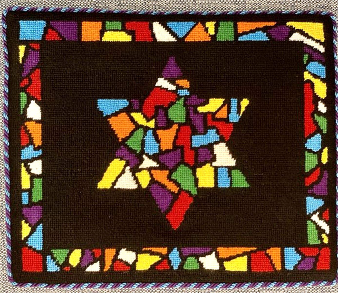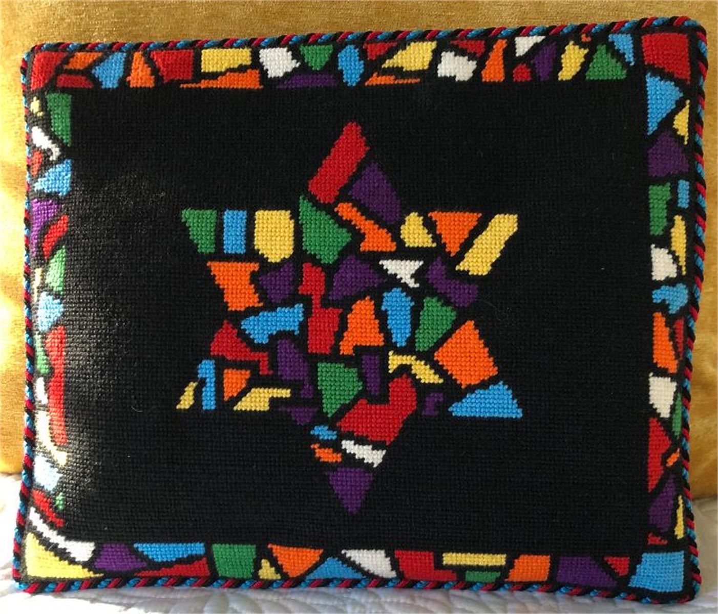 Are you a stained glass fan? This tallit bag is for you. This is a modern, neat design. You stitch the front. After it is completely stitched, it is sent to a professional finisher who adds a lining, back, and matching zipper.There is a matching tefillin bag available for this design.