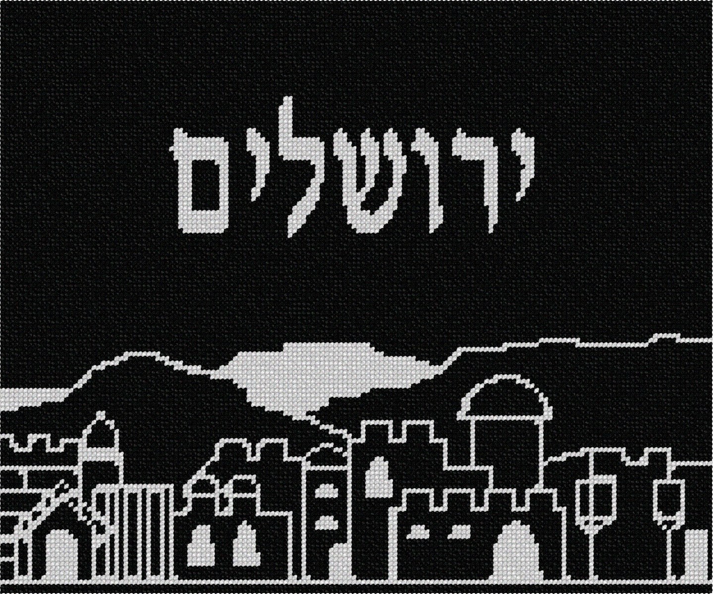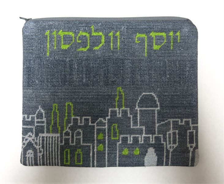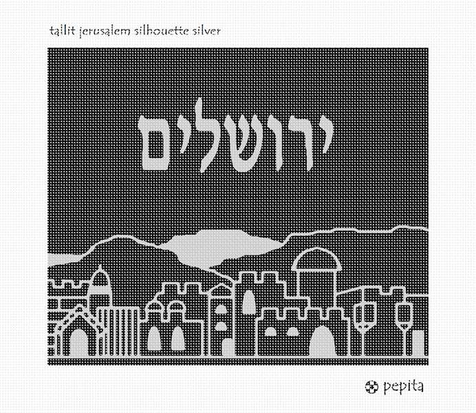 A tallit bag design with the silhouette of Jerusalem. This is a modern, neat design. You stitch the front. After it is completely stitched, it is sent to a professional finisher who adds a lining, back, and matching zipper.There is a matching tefillin bag available for this design.
