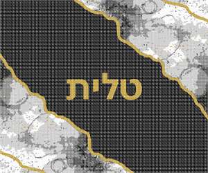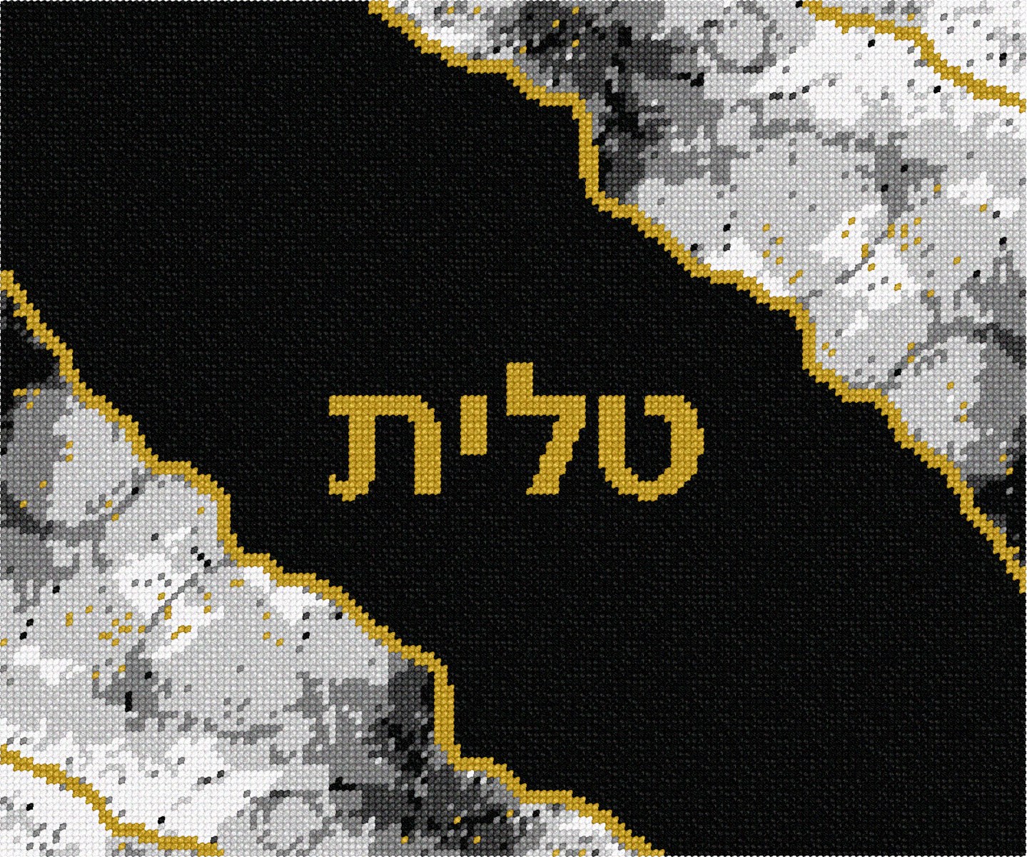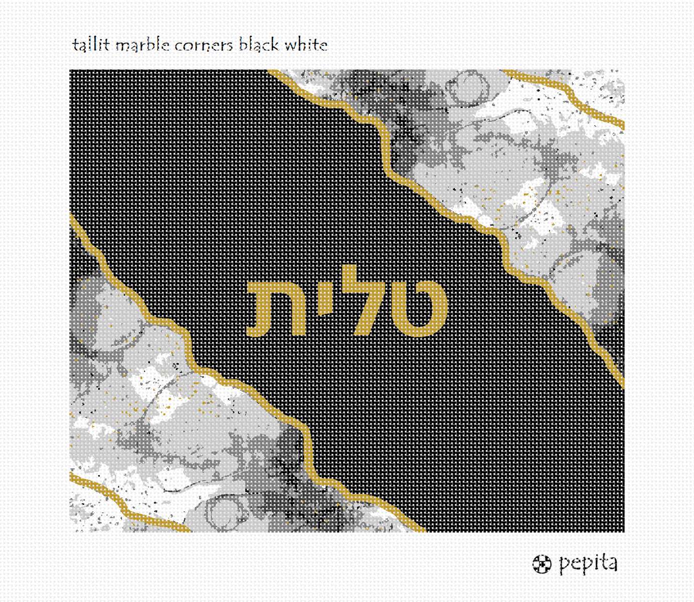 Gorgeous tallit needlepoint with a modern black and white marble design. Flecks of gold enhance the marbleized effect. After it is completely stitched, it is sent to a professional finisher who adds a lining and a back to turn it into a tallit bag for a bar mitzvah to keep his treasured tallit. See coordinating tefillin bag design.