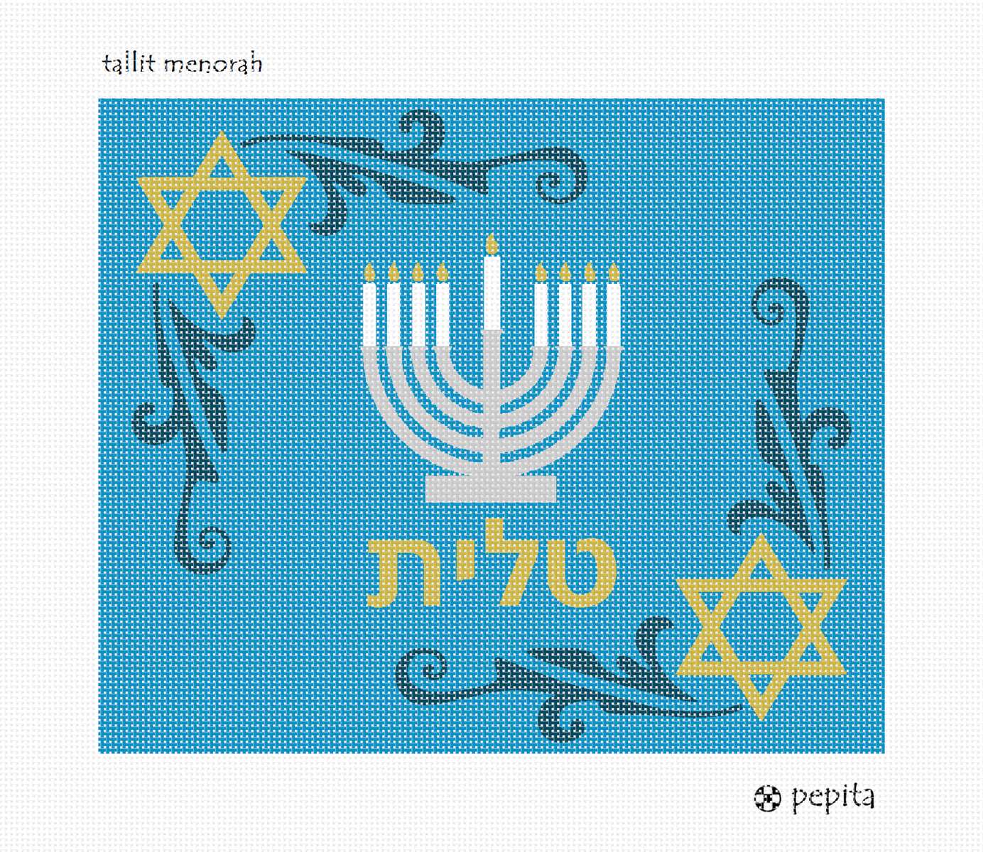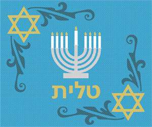A tallit adorned with a Menorah and Jewish Stars. Stitch this beauty for a bar mitzvah boy. This contemporary design will be appreciated till 120. It is suitable for husbands, fathers, and grandfathers as well. You stitch the front. After it is completely stitched, it is sent to a professional finisher who adds a lining, back, and matching zipper.