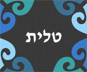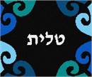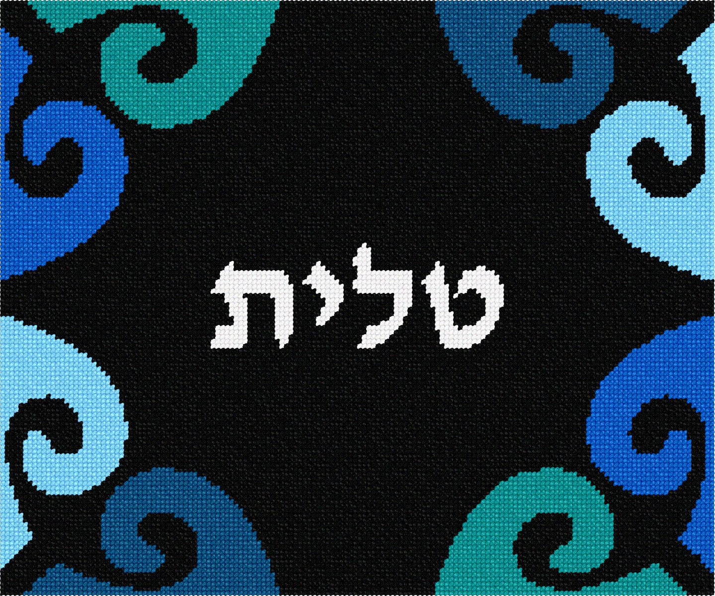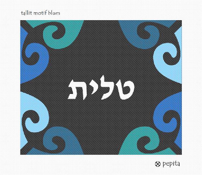 Motifs in shades of blue. Geometrics are very vogue in tallit and tefillin bags today. You stitch the front. After it is completely stitched, it is sent to a professional finisher who adds a lining, back, and matching zipper. See coordinating tefillin bag.